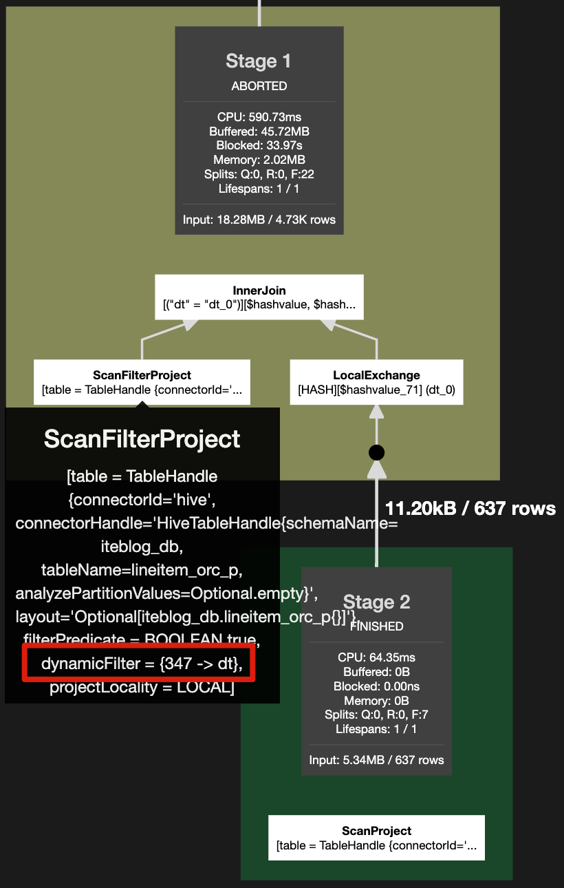 可见,lineitem_orc_p 表的读取多了一个 dynamicFilter = {347 -> dt} 动态过滤条件,其等价于 lineitem_orc_p.dt in (select dt from orders_orc_p where o_orderdate = DATE '1992-11-19')。