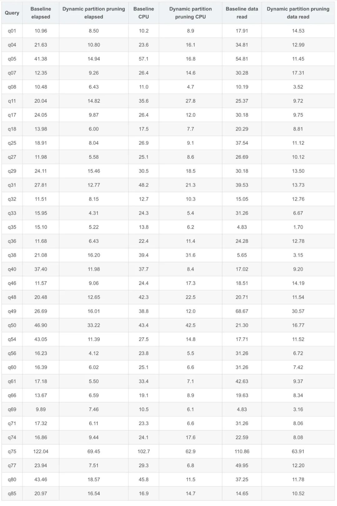 Q7 查询性能提升了30%到50%,而 CPU 使用率平均降低了47%,数据读取减少54%。