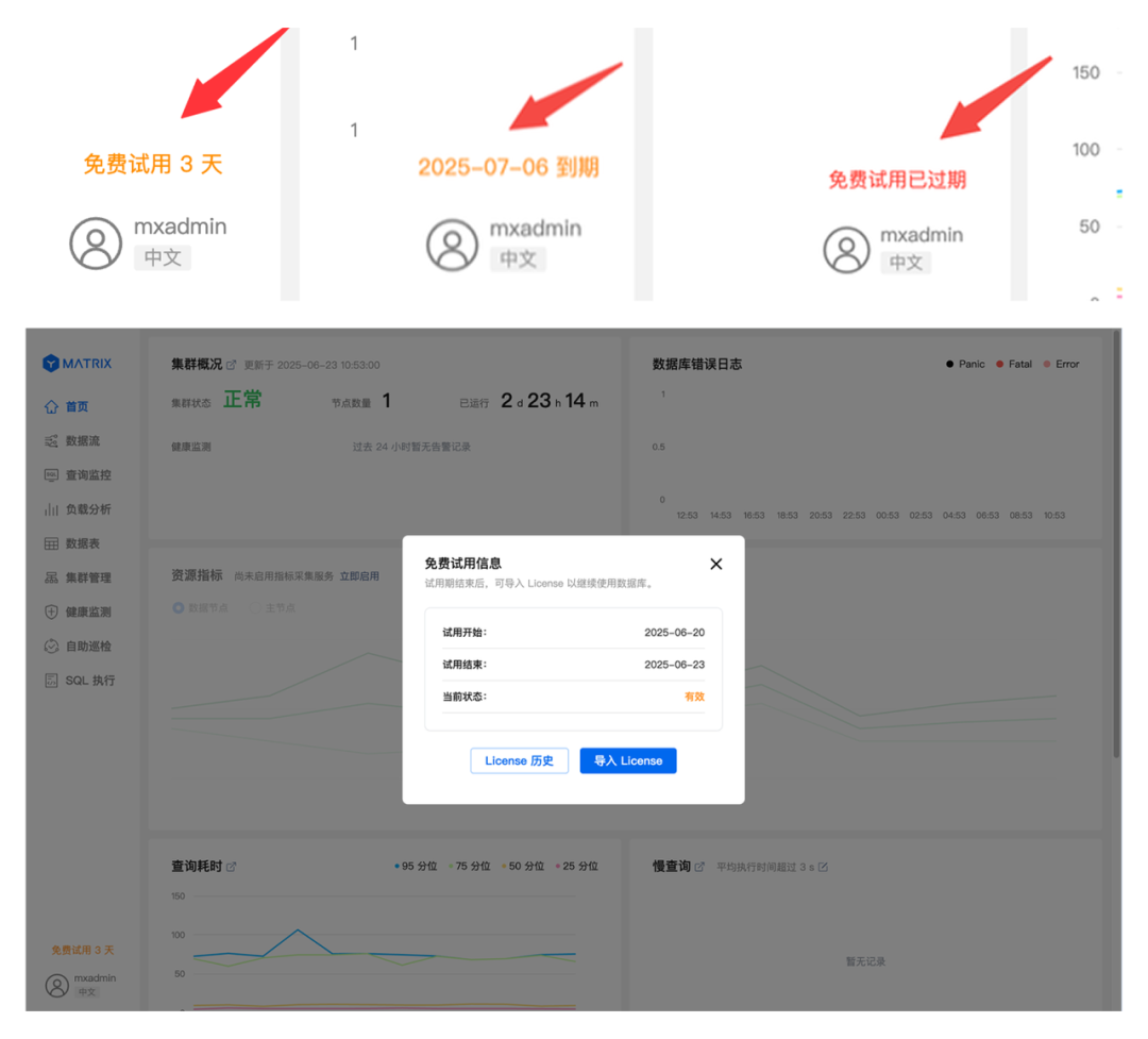 操作更方便:UI 左侧菜单栏右下角会显示到期信息(如 “免费试用 3 天”、“xxxx-xx-xx 到期”),过期后显示红色提示;点击 License 状态信息可查看详情弹窗,包含开始日期、结束日期、当前状态等。