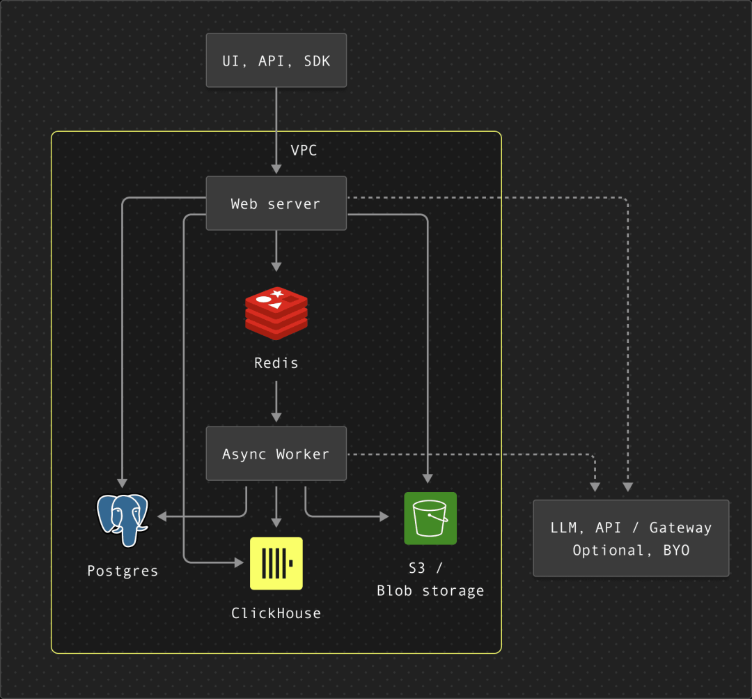 Langfuse 于 2023 年 3 月首次上线,架构简洁,对开发者十分友好:仅需一个运行在 Postgres 数据库之上的单一 Docker 容器。Clemens 表示:“这种简单架构让我们当时能快速启动,并且验证了用户确实需要这样的产品。”