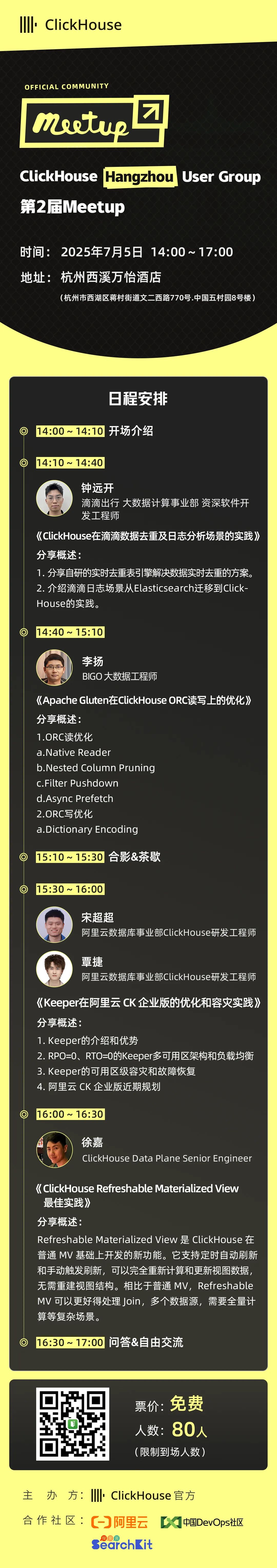 好消息:ClickHouse Hangzhou User Group第 2 届 Meetup 倒计时2天,将于2025年07月05日在杭州西溪万怡酒店(杭州市西湖区蒋村街道文二西路770号.中国五村园8号楼)举行,扫码免费报名