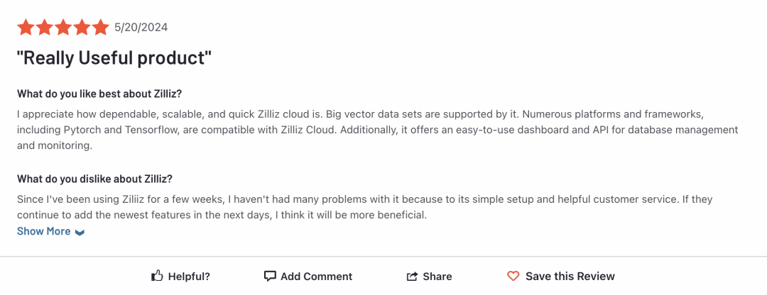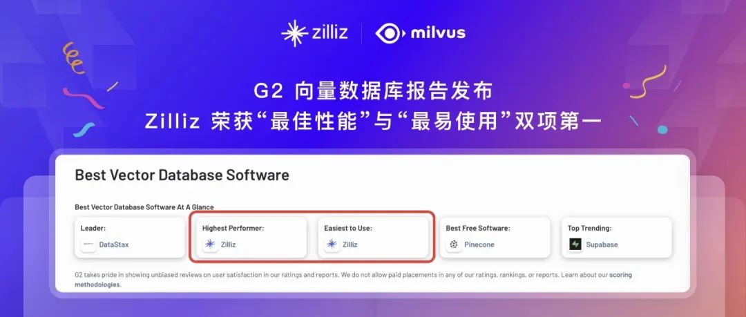 在G2的这份榜单中,Zilliz是唯一拿下两个top1的厂商,而且被评价为同时兼顾高性能与易用性。