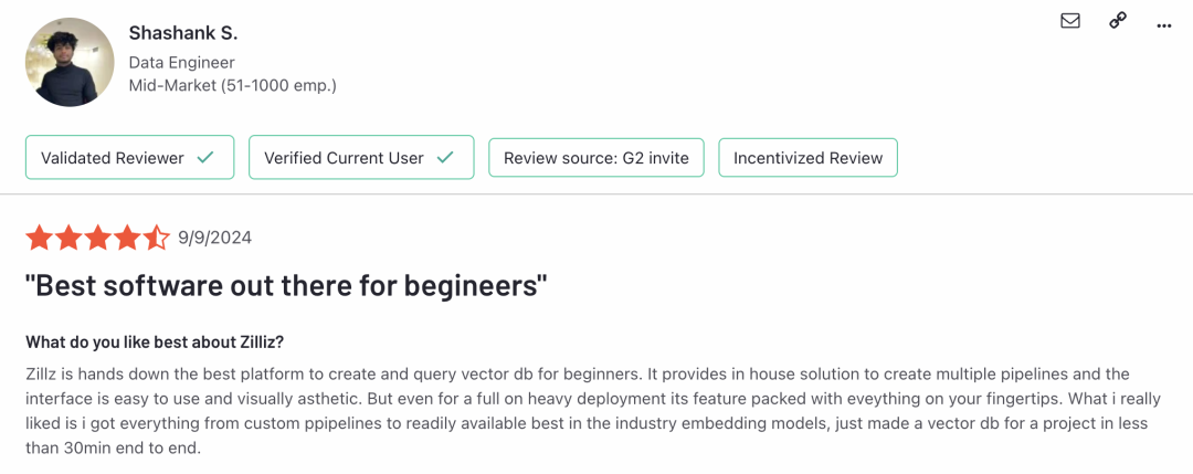 在这份报告中,比较值得一提的是,通过来自真实用户的认证评价,Zilliz 被评为向量数据库领域的“最佳表现者”和“最易使用者”,拿下双料冠军。