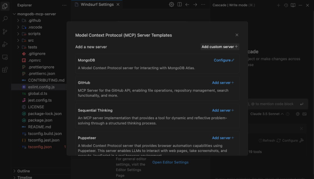 为了让世界各地的开发者能够更轻松地立即使用 MongoDB MCP 服务器,我们在Windsurf中提供了开箱即用的功能。Windsurf 是一款 AI 代码编辑器,目前已有超过一百万开发者在使用,并且这一数字还在不断增长。使用 MongoDB 进行构建的开发者可以利用 Windsurf 的代理 AI 功能来简化工作流程并加速应用程序开发。
