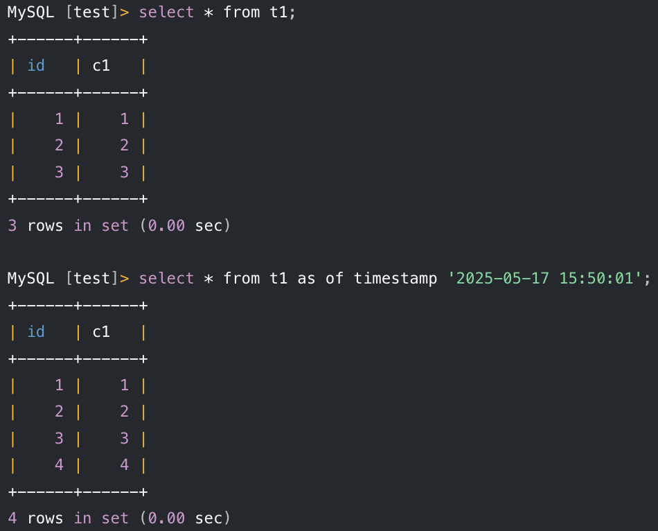 用户通过普通的 SELECT * FROM t1; 命令查询当前表t1的内容,返回了3行数据(id从1到3)。然后,用户使用闪回查询语句,查询指定时间点的数据快照,结果显示当时表中存在4行数据(id从1到4)。