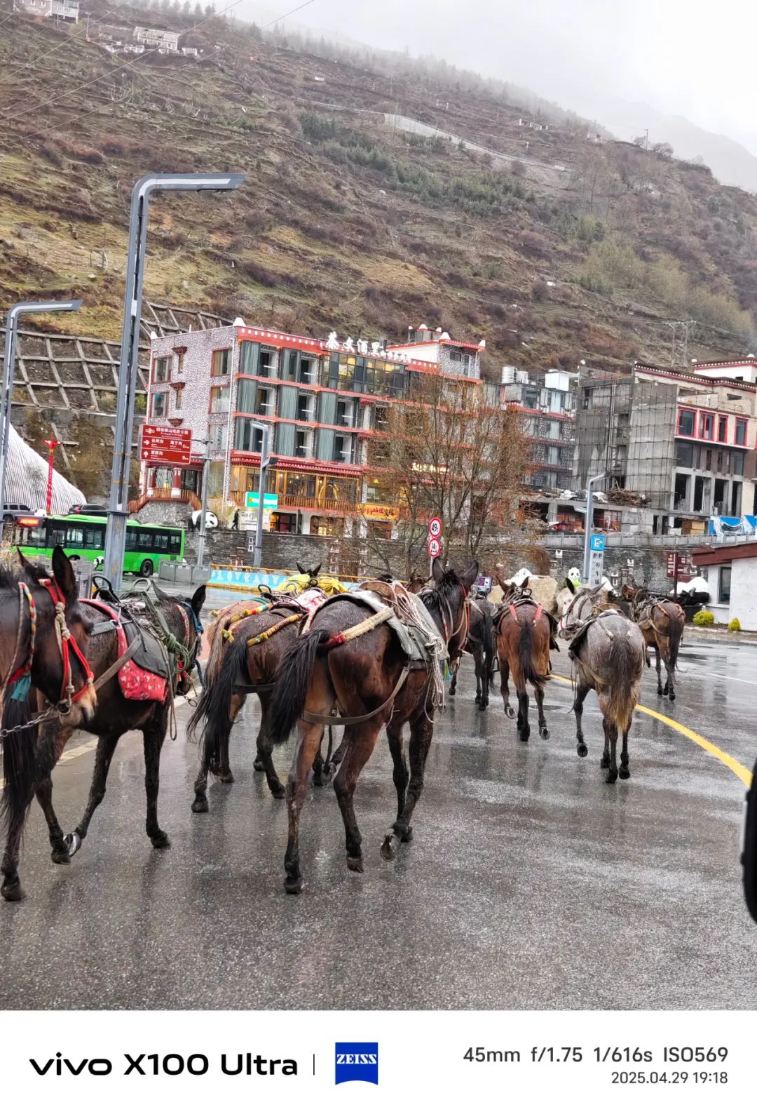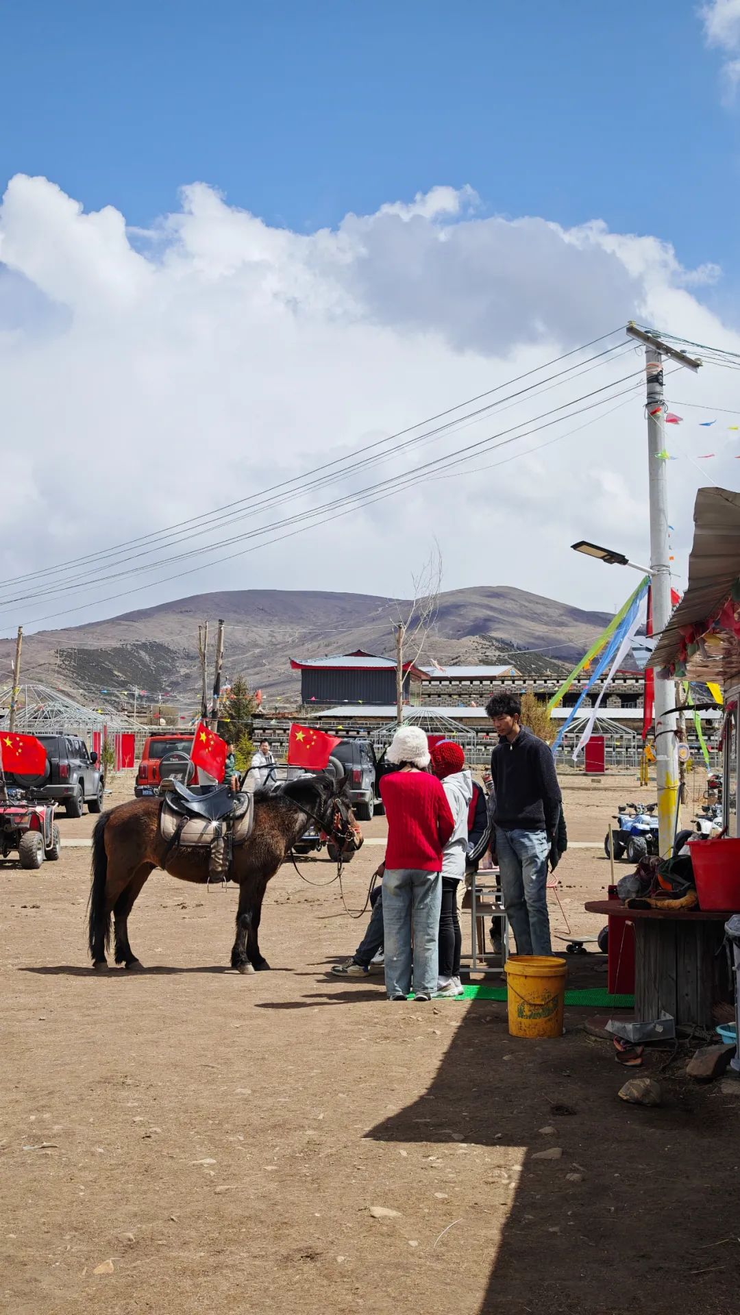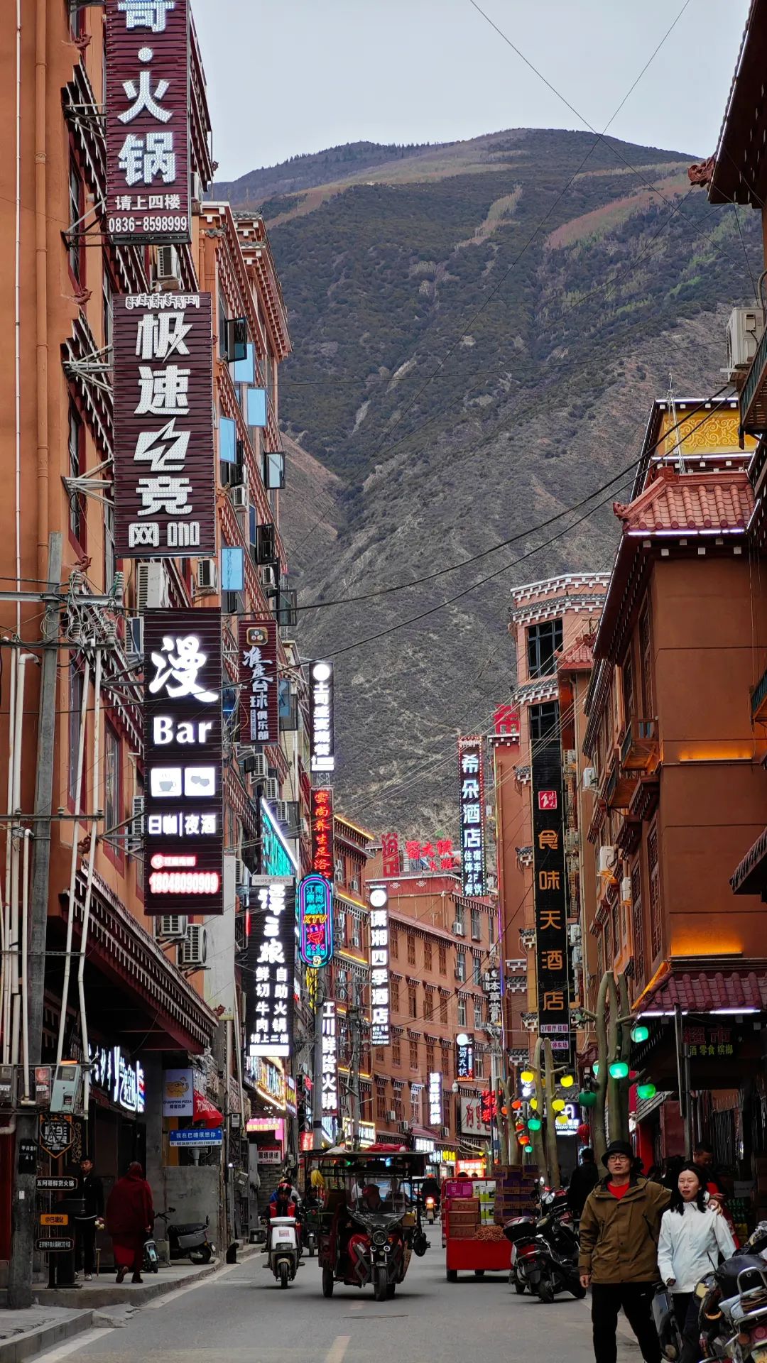 进了镇子,正巧碰上驮着货物的马帮 “嗒嗒” 地穿过马路,马蹄声伴着清脆的铃响。民宿老板早已在门口等候,热情地帮我们搬运行李,为寒冷的天气增添了几分暖意。夜晚大家围坐一堂,一锅热气腾腾、咕噜冒泡的牦牛肉火锅便是最大的满足。橙黄色的街灯亮起,四姑娘镇的轮廓比起白天的朦胧,反而显得清晰了几分。