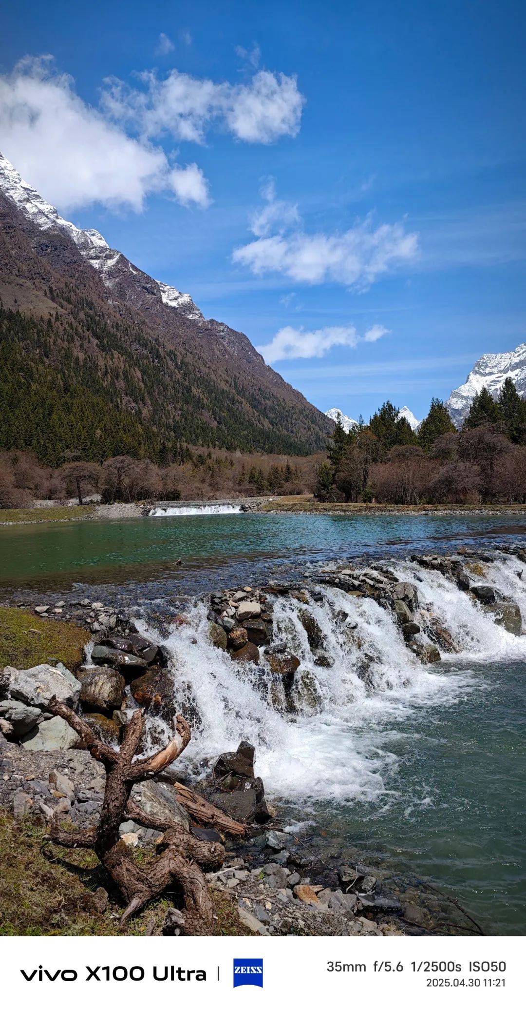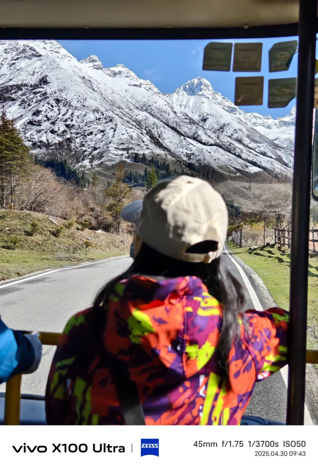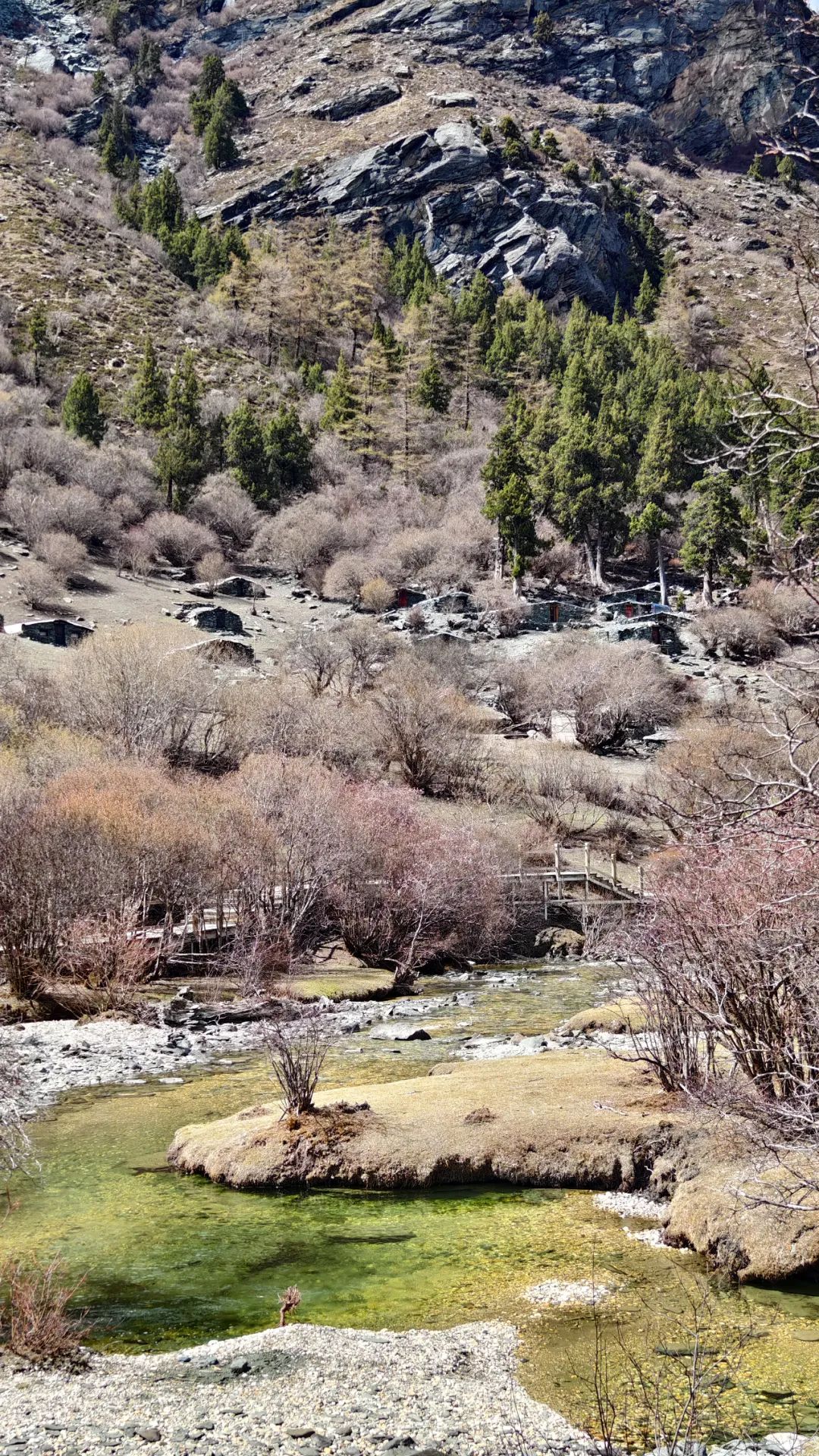 第二天进双桥沟,天气倒变得晴朗起来了。坐上观光车往里走,路两边的雪山一座接一座冒出来,果真如同盲盒般带来连连惊喜。五月的山谷,草尖才刚冒头,溪水却已涨得欢腾,哗啦啦地撞击着溪石。