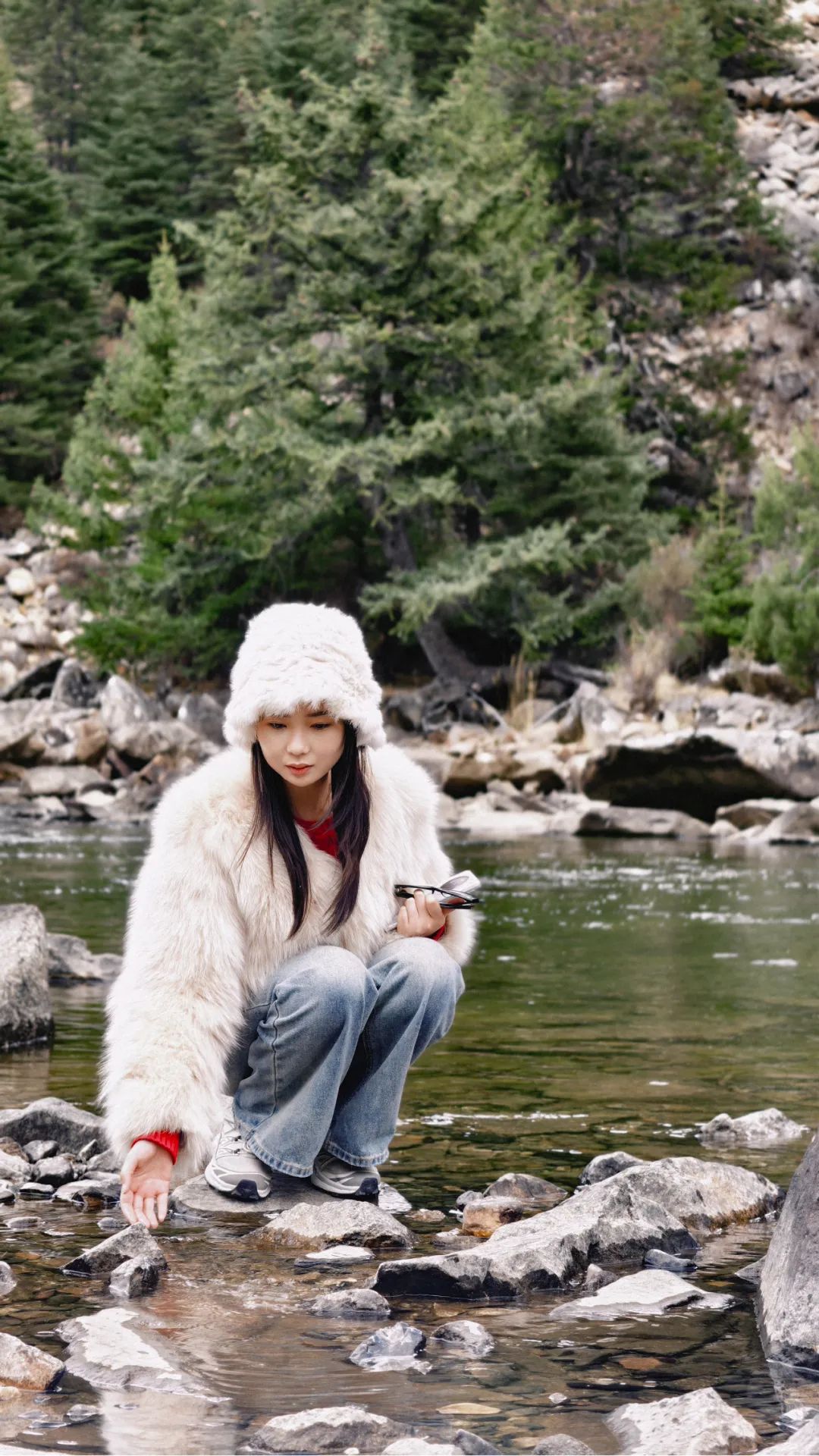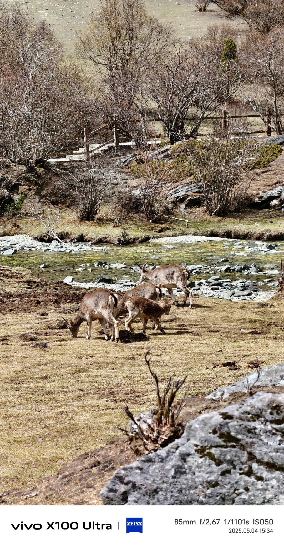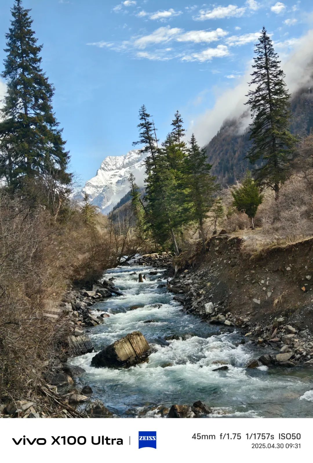 第二天进双桥沟,天气倒变得晴朗起来了。坐上观光车往里走,路两边的雪山一座接一座冒出来,果真如同盲盒般带来连连惊喜。五月的山谷,草尖才刚冒头,溪水却已涨得欢腾,哗啦啦地撞击着溪石。