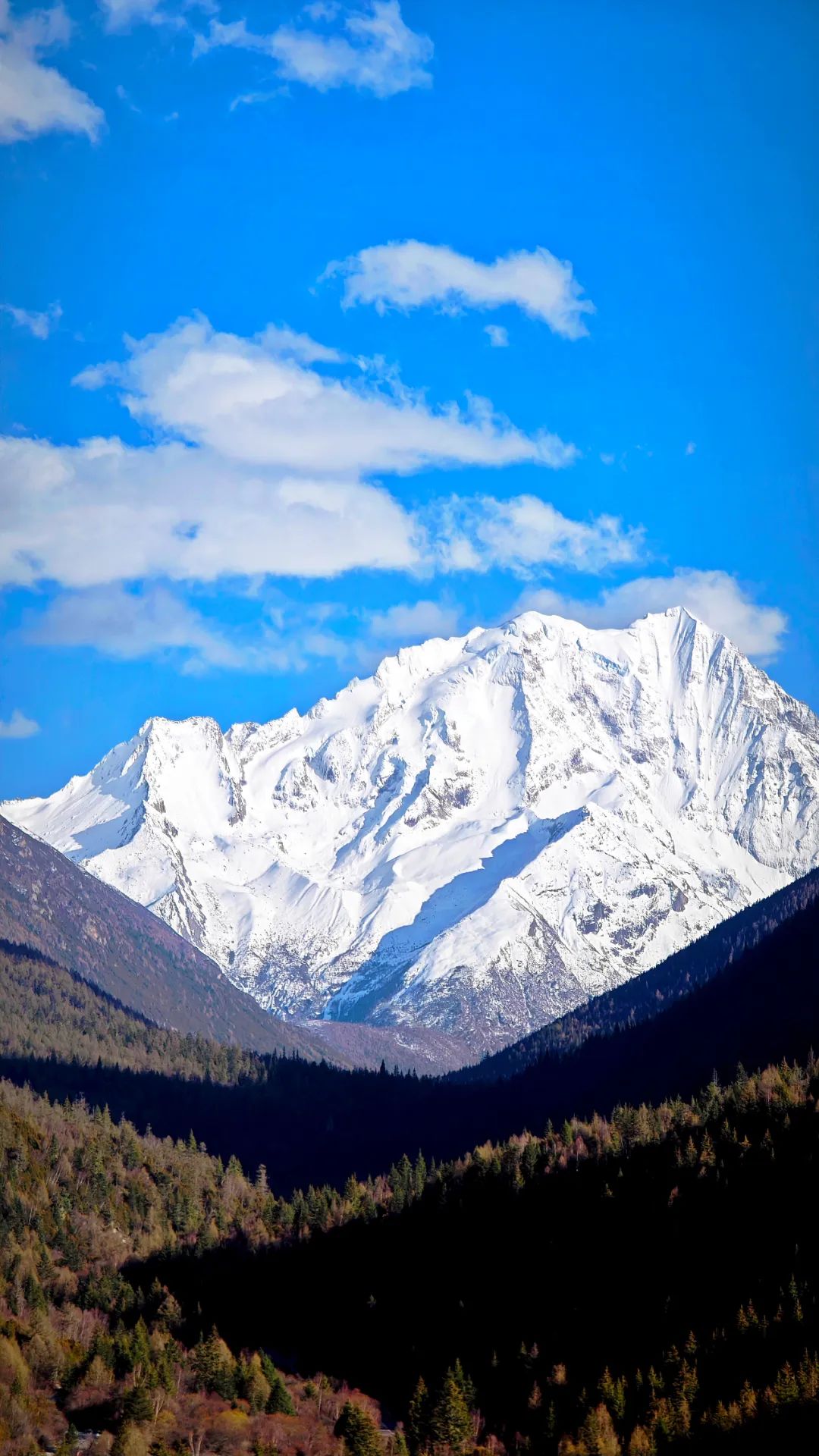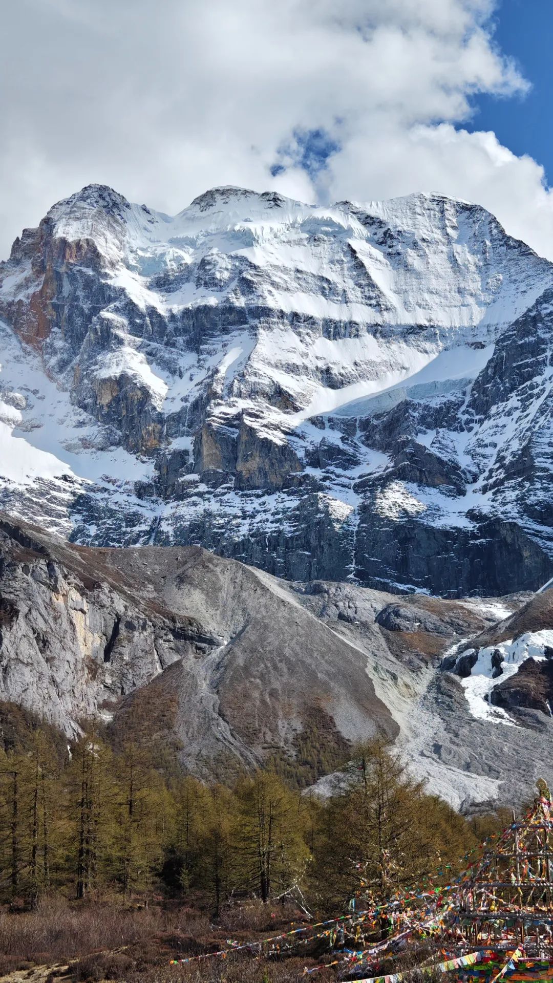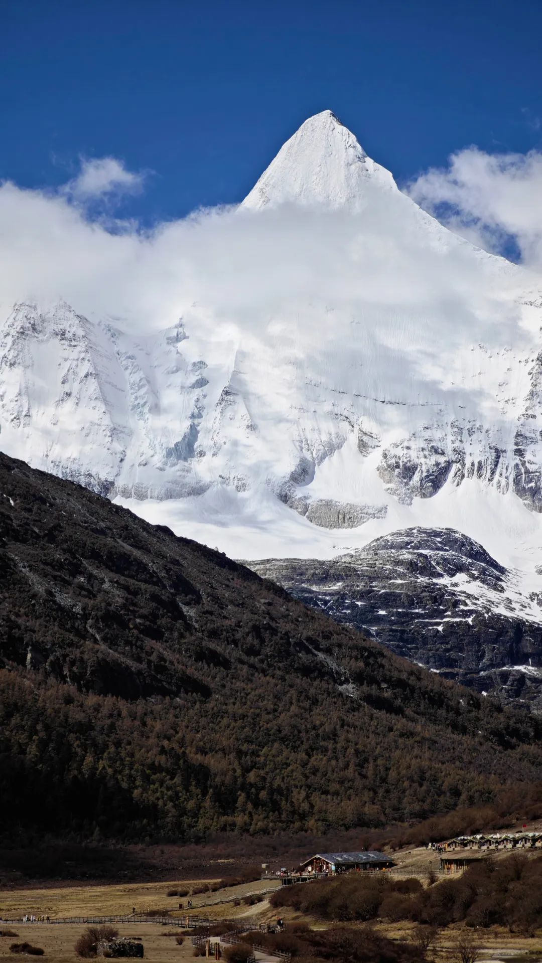 夏诺多吉如利剑直插天际,冷峻山体闪耀银光,陡峭岩壁刻满岁月沧桑;央迈勇似端庄少女,山腰的白云像是半遮容颜的面纱,美丽又神秘;仙乃日像慈祥老者,庞大身躯尽显包容,千年冰川晶莹剔透。三座神山就这样毫无保留地展现在我们眼前,壮丽震撼,令人敬畏自然之神奇伟大。