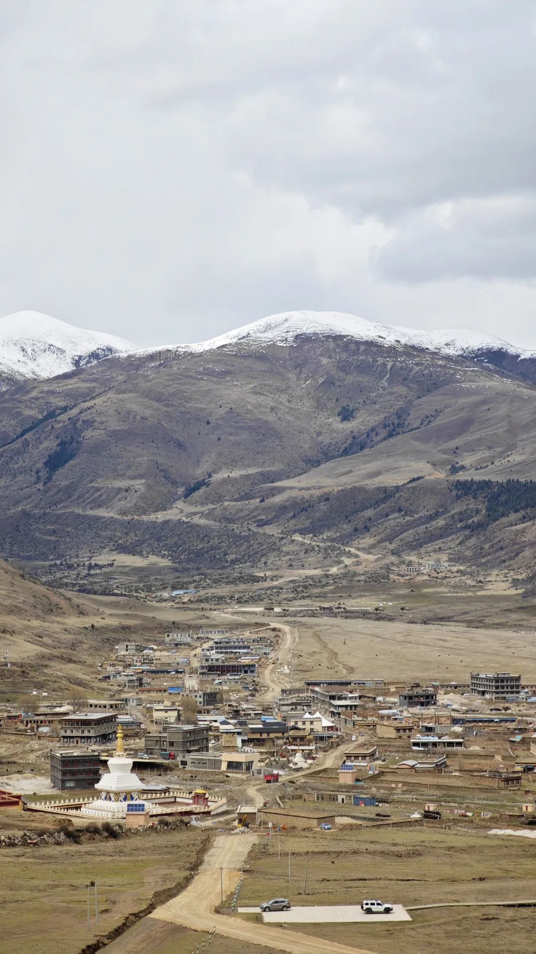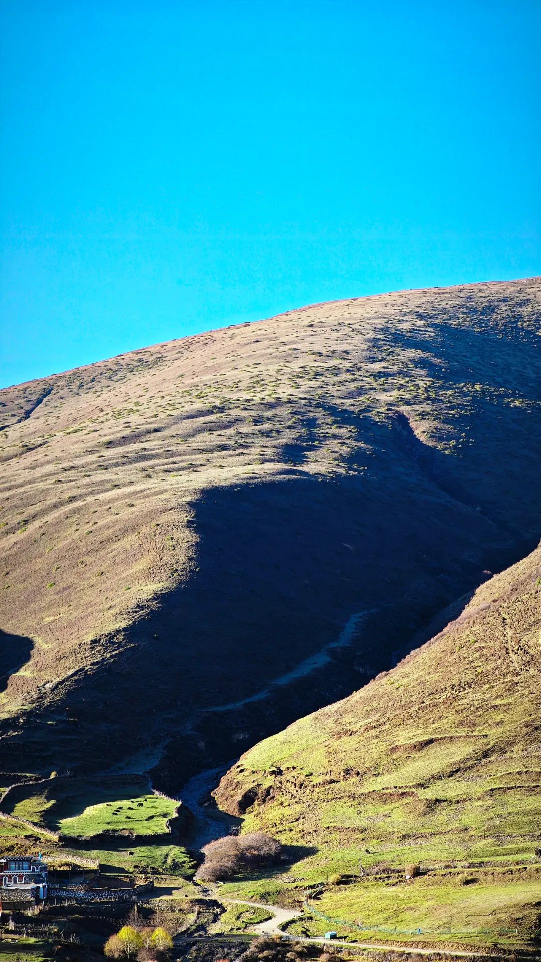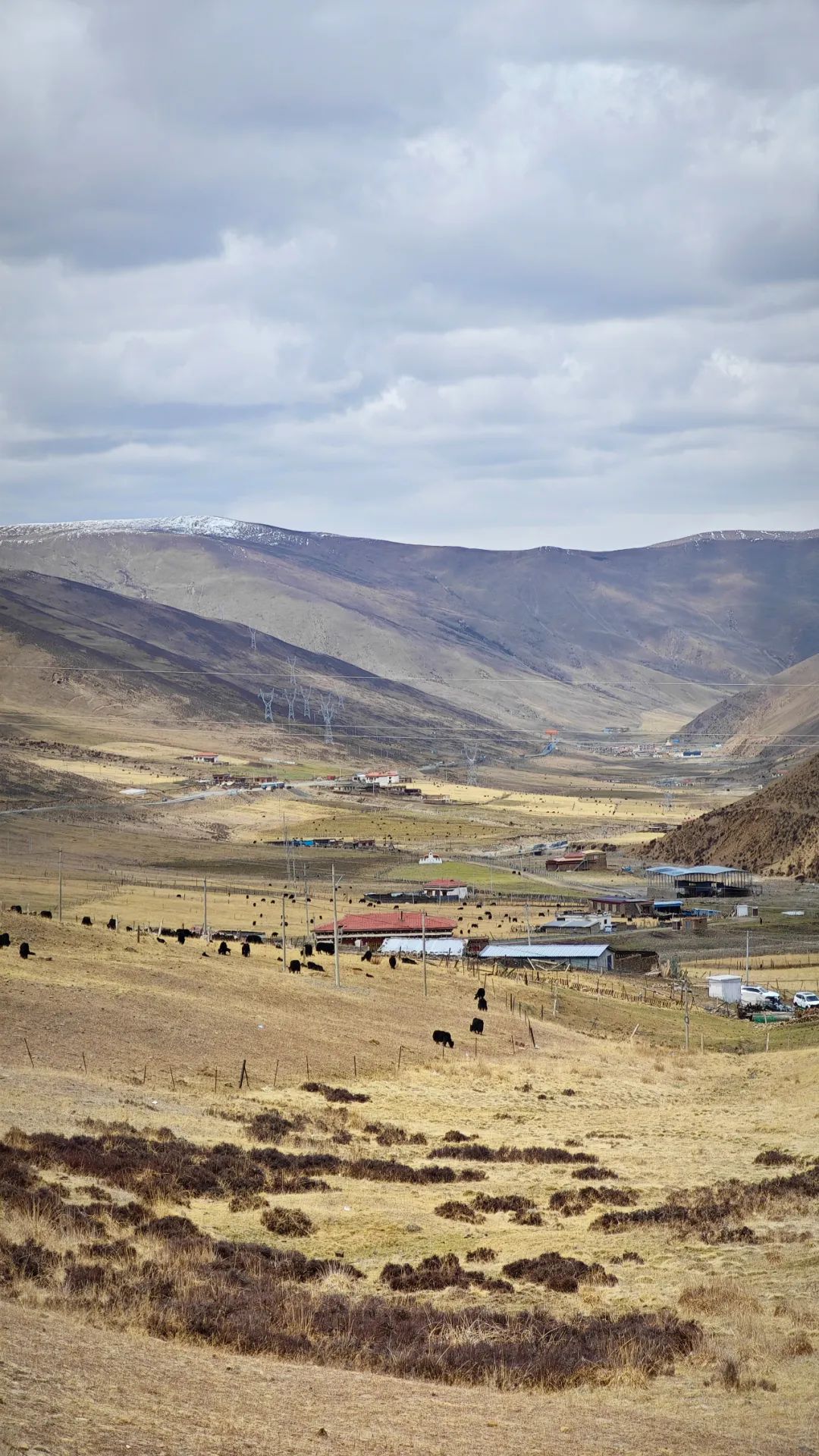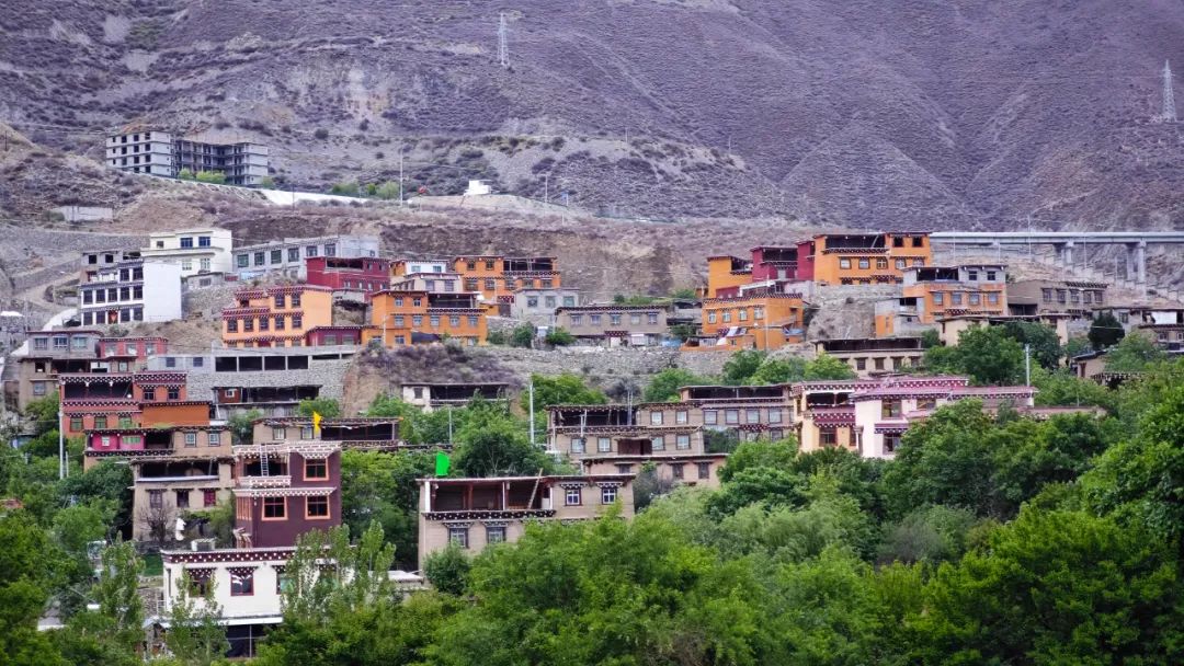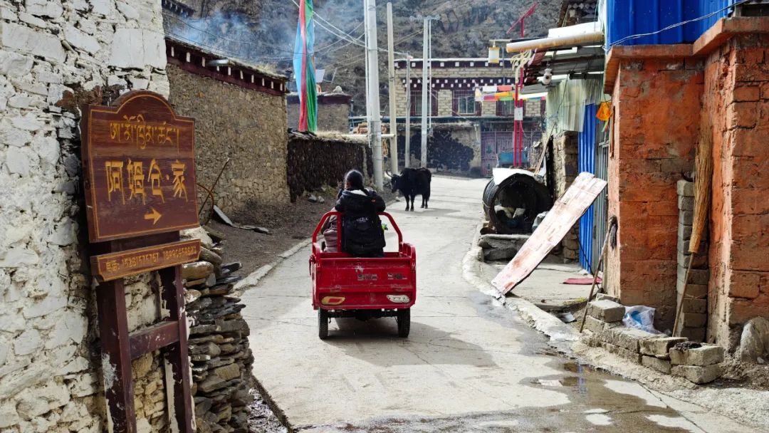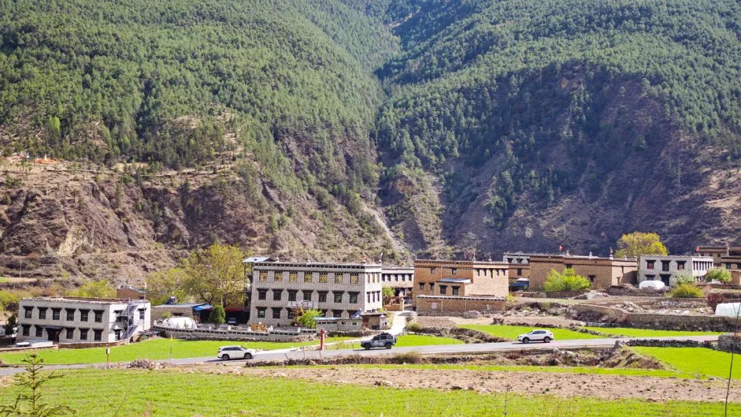 当车子终于爬到对面的山坡,然日卡村像一幅厚重的油画突然铺展在眼前。远远望去,村子窝在山坳里,周围是裸露的山脊和枯黄的草甸,小伙伴们不由得感叹了一句:“真狂野啊!”