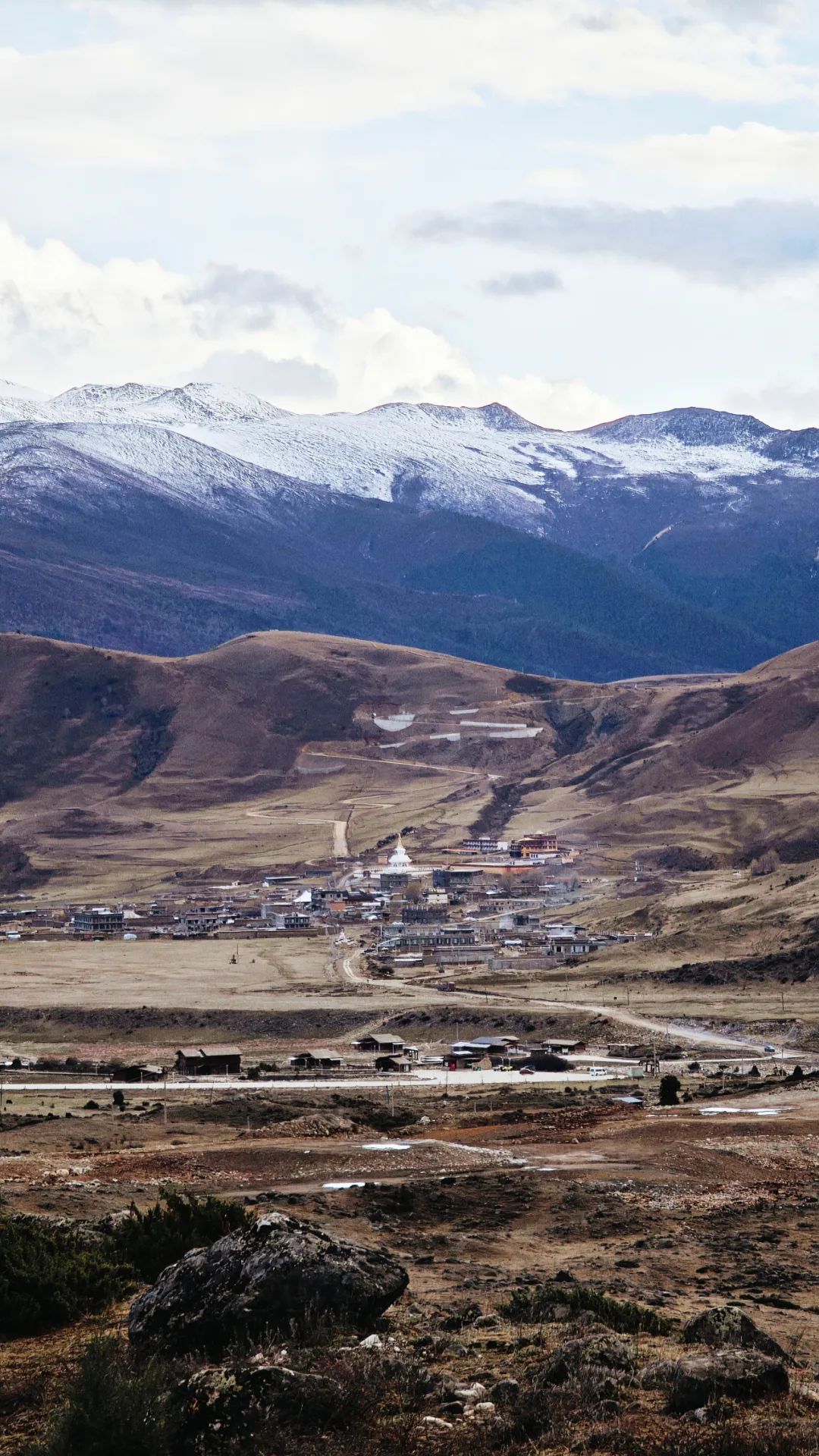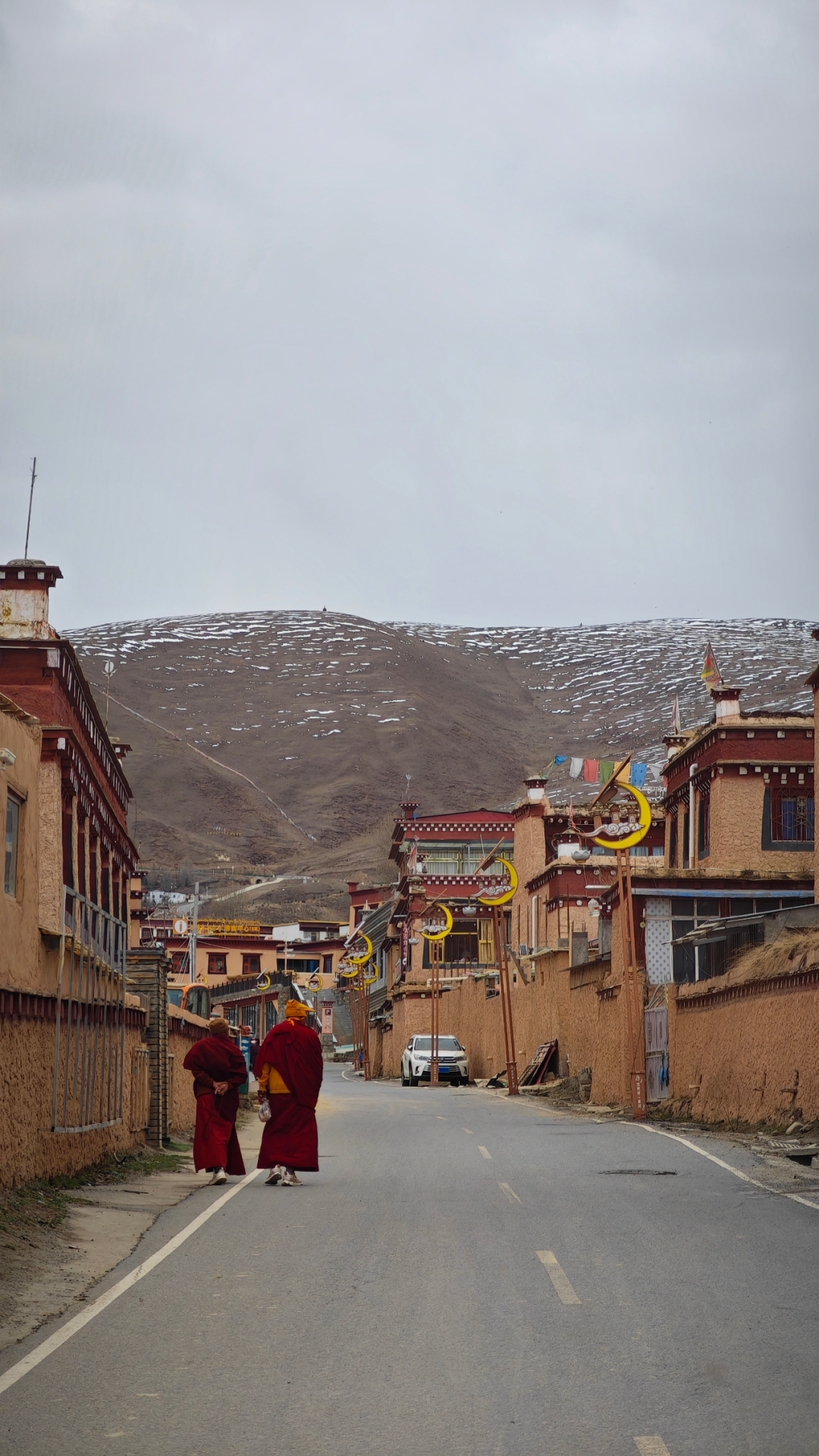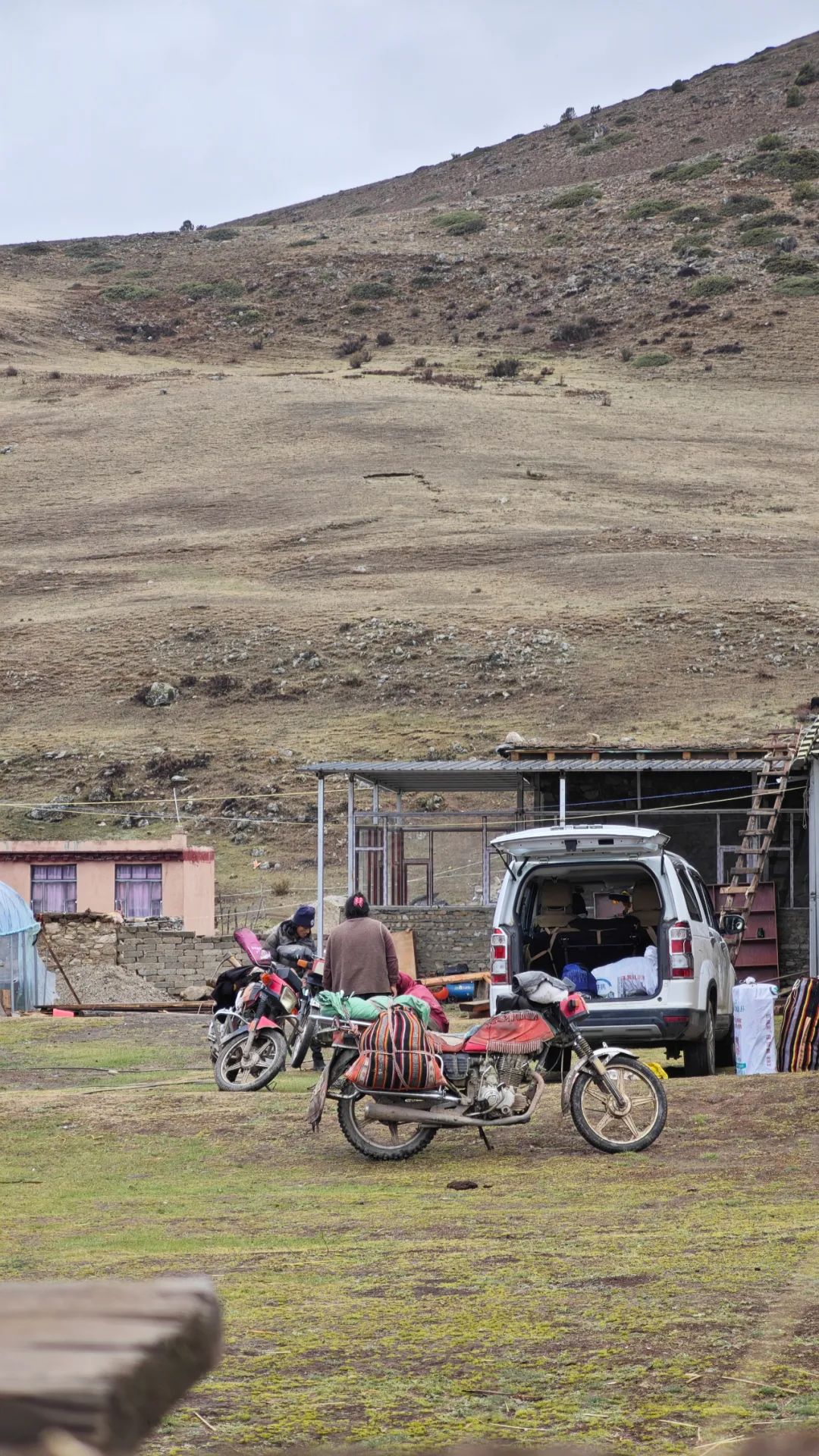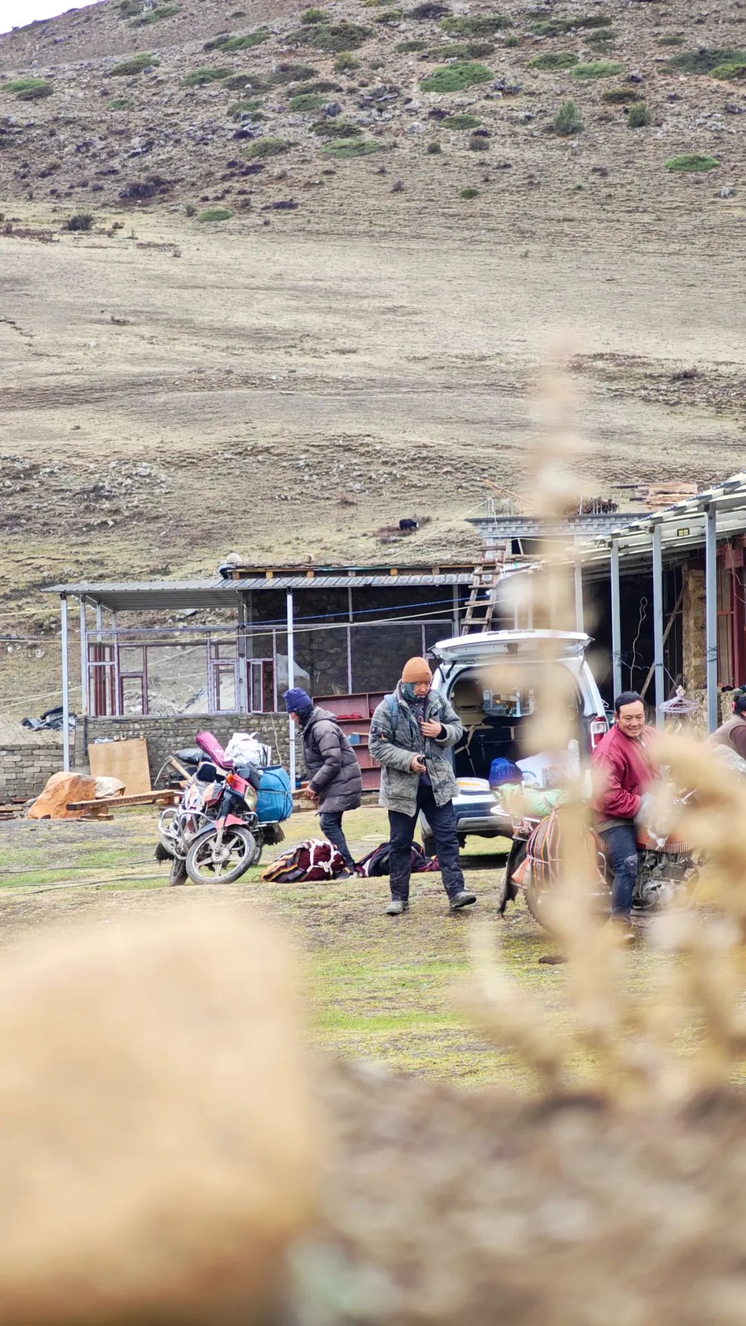 当车子终于爬到对面的山坡,然日卡村像一幅厚重的油画突然铺展在眼前。远远望去,村子窝在山坳里,周围是裸露的山脊和枯黄的草甸,小伙伴们不由得感叹了一句:“真狂野啊!”