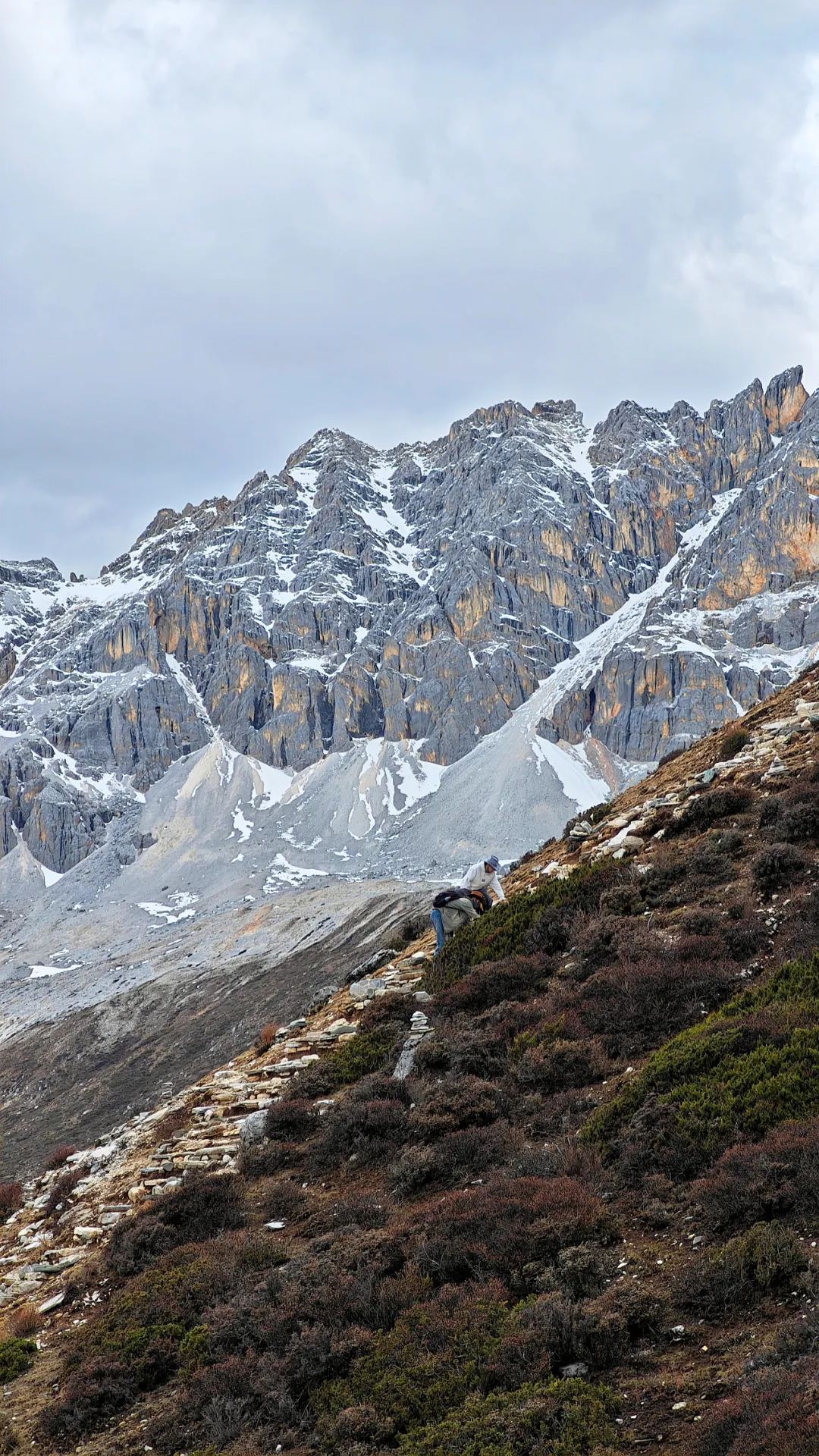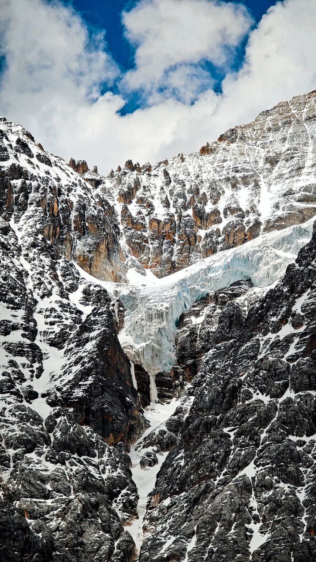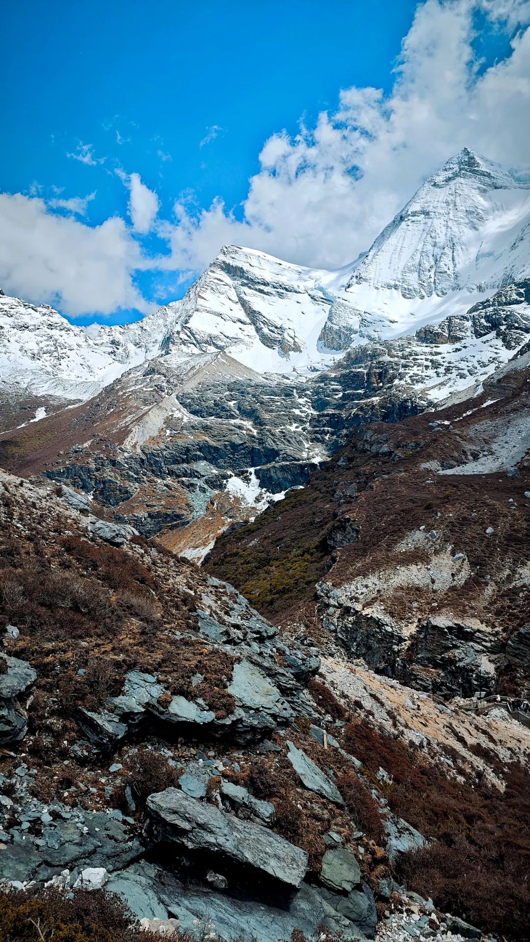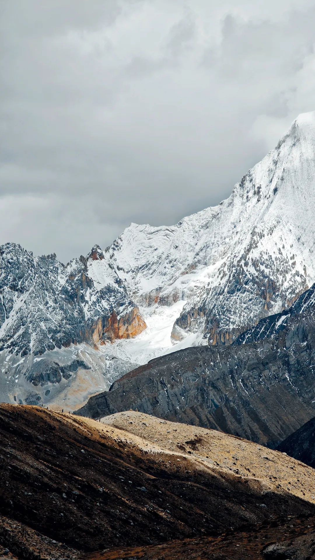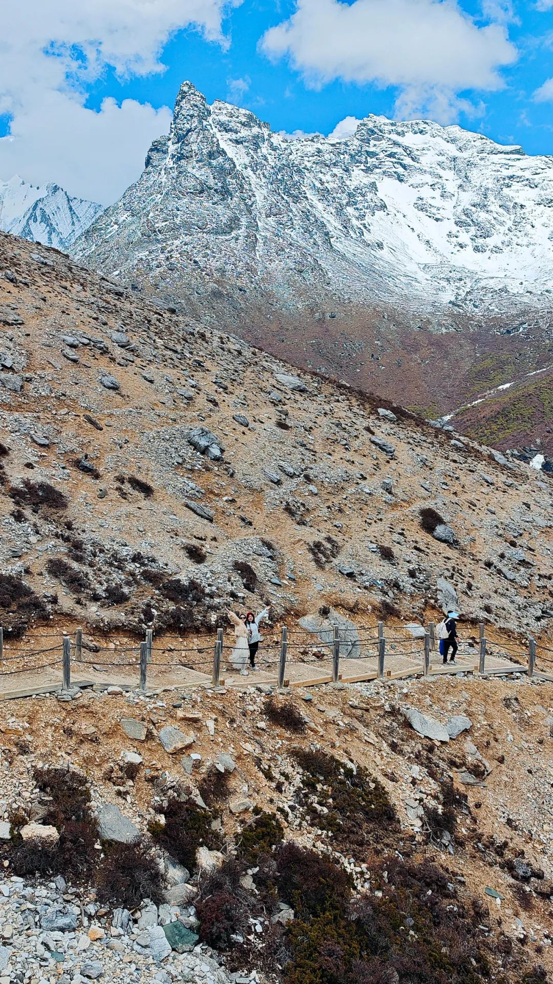 在海拔4000多米的高原爬山道上,我们上演真实的一步一喘气五步一吸氧,活像一群老式拖拉机开在盘山公路。路两边,雪线以上的雪山一眼望不到头,白花花的冰川在太阳底下亮得刺眼,裂缝阴影处藏着冰川独有的蓝,冷冽又神秘。雪线以下,山体裸露嶙峋,黑褐色的高山杜鹃东一丛西一丛,跟灰白色的岩石掺在一起,看着有点扎眼,却又透着一股倔强的生命力。在呼呼的喘气声中,我们这沿途的行人,倒像是闯进了一幅没上色完的粗犷水墨画里。