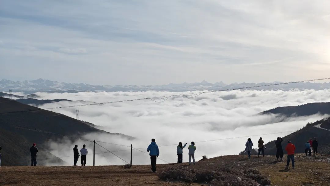 云雾和背后的雪山连成一片,白茫茫的,仿佛真的置身天际。