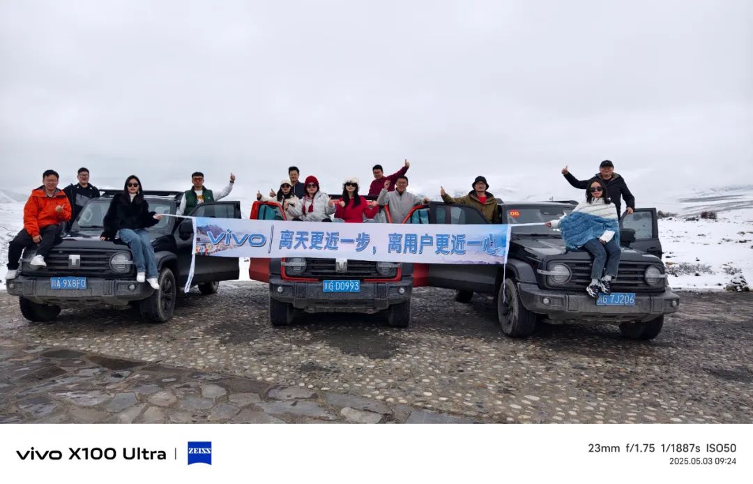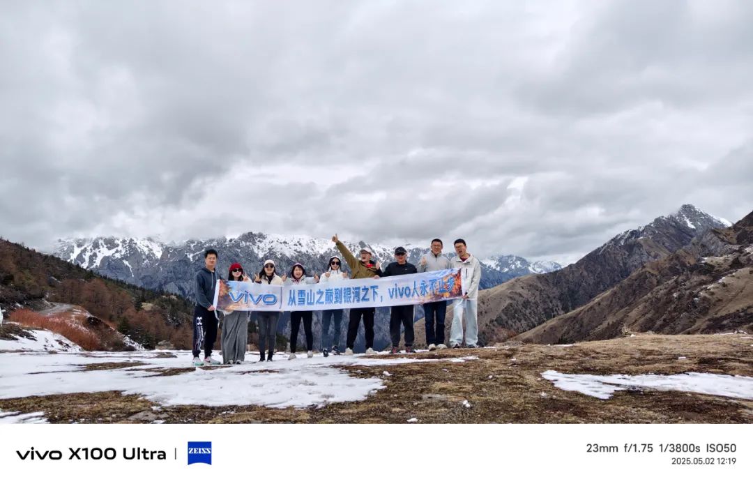 这次我们走上了雪山之巅,可因为天气原因,没能见到高原上的银河。不过后一批去的同事们拍到了星星,就像横幅上后半句写的 “vivo人永不止步”