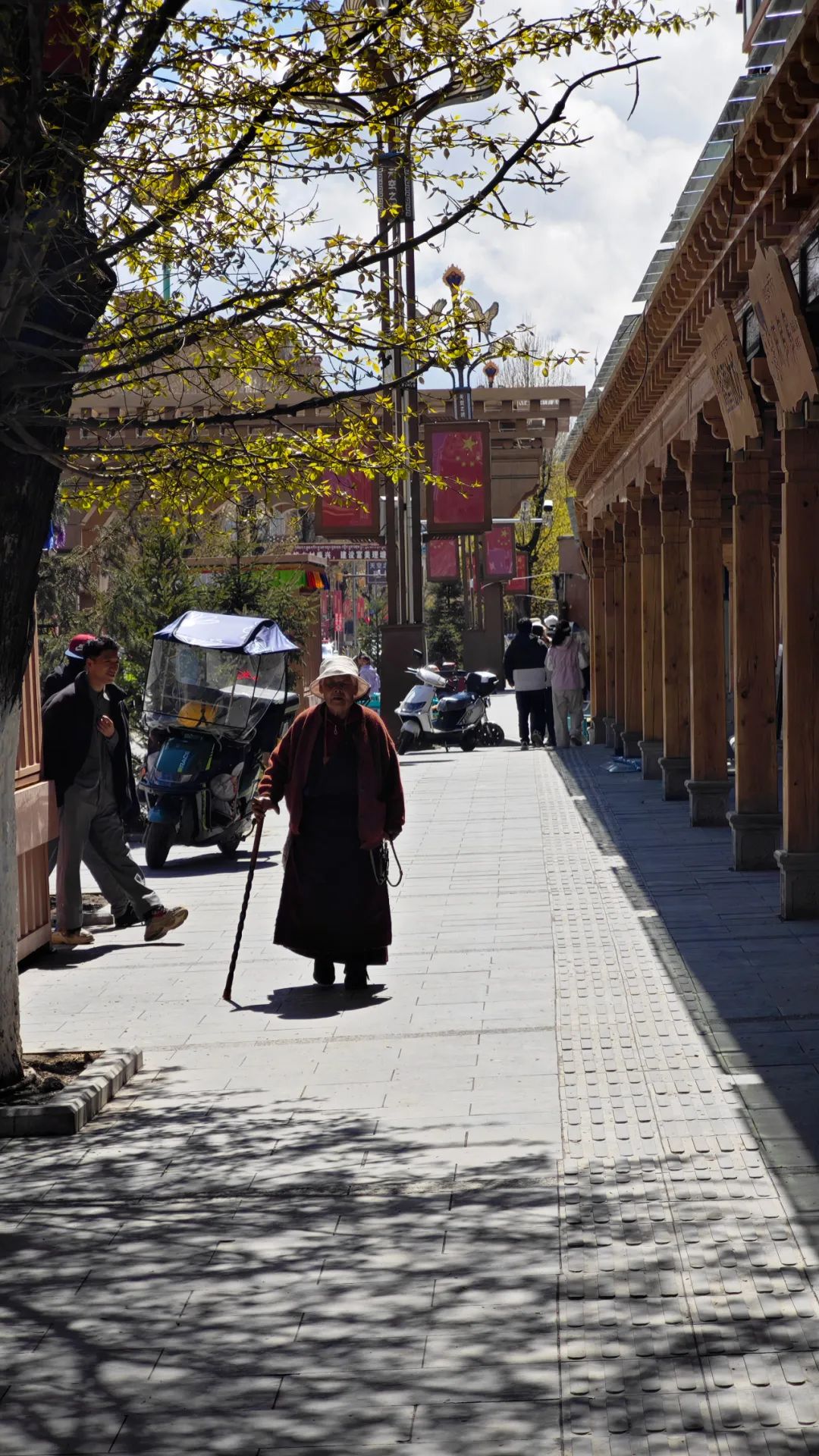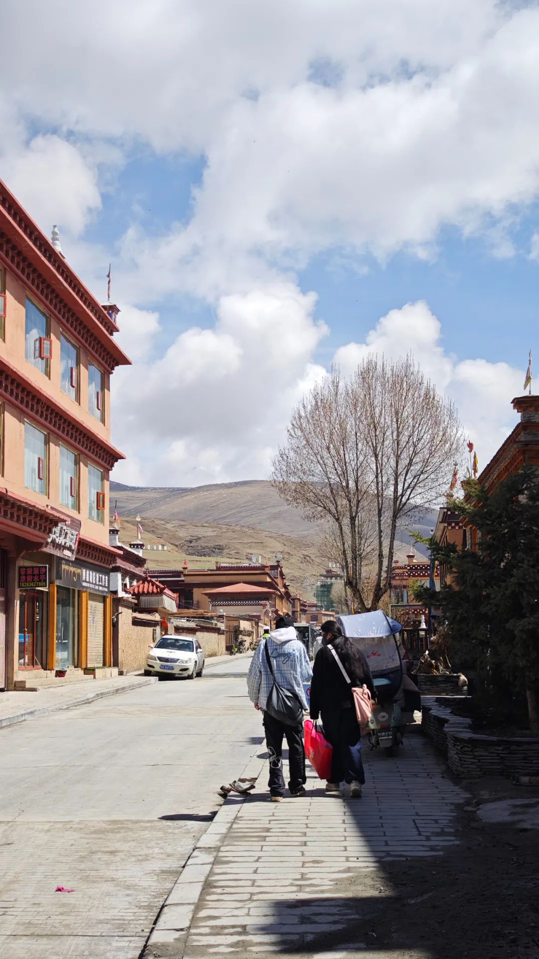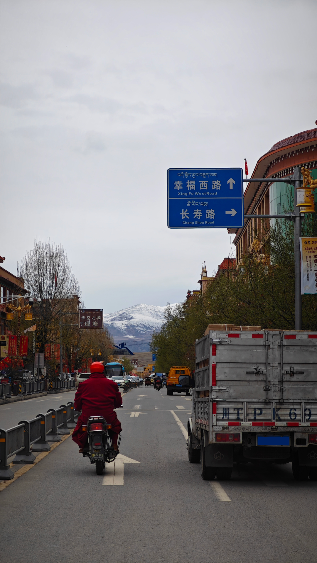 当汽车在318国道上转了一个180度的大弯从理塘东门直入理塘县城时,我们算是真切感受到了啥叫“伸手能碰着云”。这座被群山托起的“天空之城”,海拔4014米,是世界最高城。周围是广袤的高原草甸,晴朗的日子里,雪山、蓝天、草甸衬着藏式房子、慢悠的行人走在光影斑驳的道路上,一切都美得像画卷一样。
