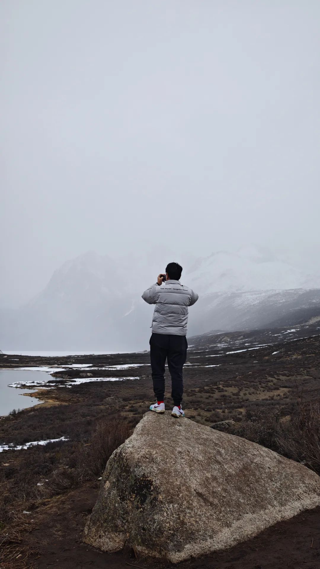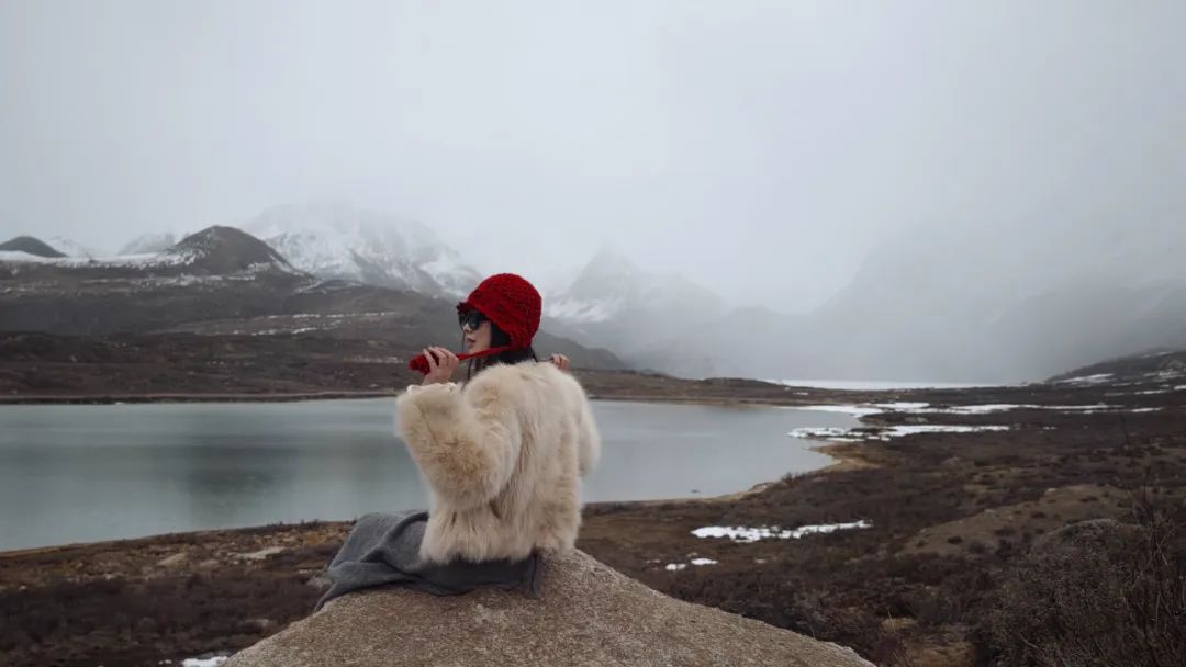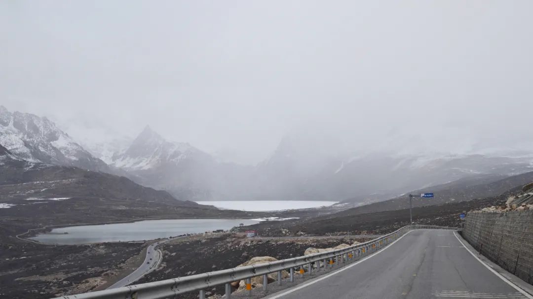 从理塘西门拐上318国道一路往西走,车子一头就扎进了辽阔的毛垭大草原 —— 四五月阴天的毛垭大草原,丝毫没有七八月时绿毯般的柔软,一身冷硬的模样,草皮泛着灰黄,夹杂着未化尽的残雪,显得冷硬萧瑟,仿佛被大风刮秃了头。牦牛孤零零地散布着,它们低垂着头专注地在地上刨食。不远处,无量河蜿蜒曲折,就像一条灵动的丝带,只是那流淌的姿态显得有些清冷。海子山垭口积雪深至脚裸,雪原上正飘着雪花,看着这洁白的一片雪,实在让人忍不住想上去踩上几脚,顺便抓起几把雪来扔向同伴打闹一番,只是海拔4600+的垭口并不懂情趣,还没跑两步,就都因为缺氧呼吸不畅,只能乖乖回到车上大口吸氧了。继续向前下一条长坡,姊妹湖在云雾的缭绕下半遮半掩,倒增添了几分神秘的气息。