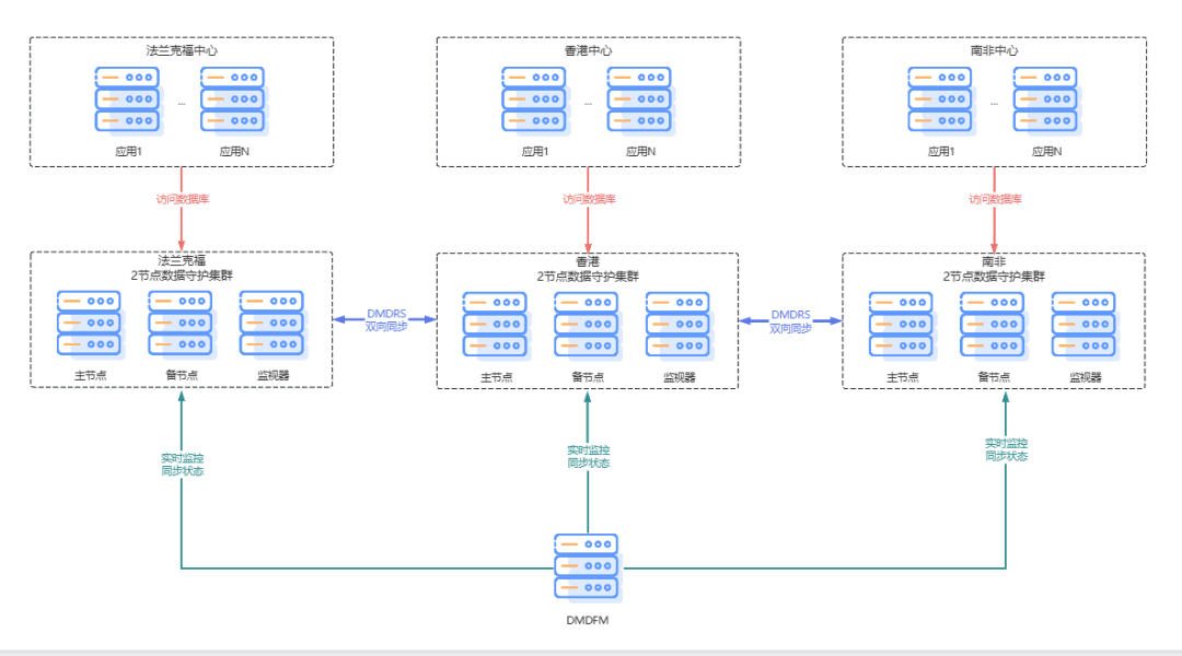 为实现对整体同步状态进行监控和管理,采用了达梦数据融合管理平台DMDFM实现全局可视化管控。该平台集安装配置、设计管理、监控运维三大功能于一体。对跨地域的数据库集群状态、数据同步链路进行集中化监控、管理和预警,实现安装配置、运行维护一体化,显著降低全球化架构的运维复杂度。