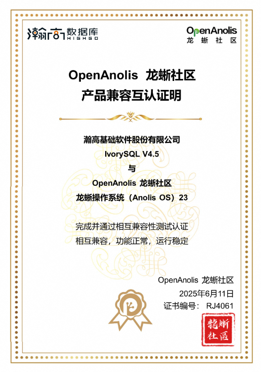 近日,龙蜥操作系统 Anolis OS 23与瀚高股份 IvorySQL 产品完成了相互兼容性测试认证,结果显示:相互兼容,功能正常,运行稳定。