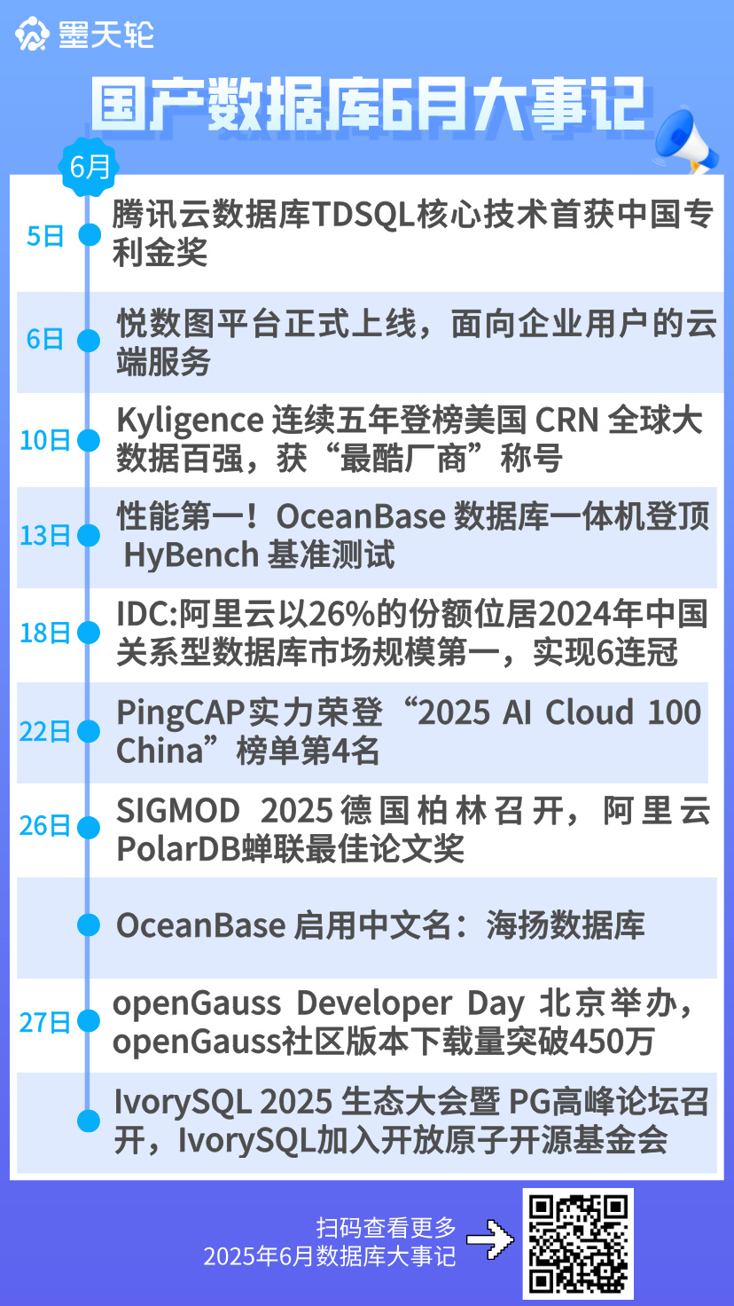 本文整理了2025年6月国产数据库大事件和重要产品发布消息。