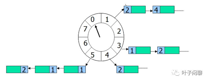 我们加入一个新的超时任务时, 会根据超时的任务的超时时间与时间轮开始时间算出来它应该在的槽位.