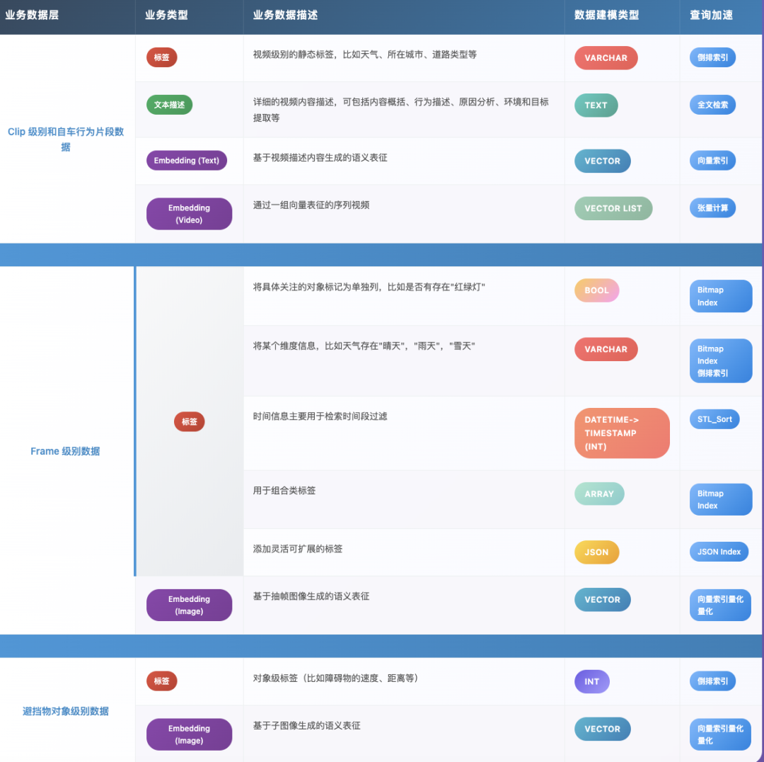 到了近两年,通过多模态大模型(如 GPT-4o、Gemini),已经无需随着数据需求的变化而微调模型,就能够在大型数据集中识别罕见或复杂的模式,直接从原始视频中提取细粒度语义。而基于多模态大模型输出的视频级别的 Cilp、图像级别的 Frame 以及子图级别的 Sub-object等数据,会进一步变成标签、文本描述、embedding(text、video、inage)形式,被存储与检索,显著提升数据挖掘效率与智能化水平。