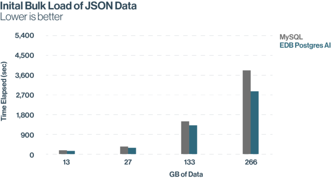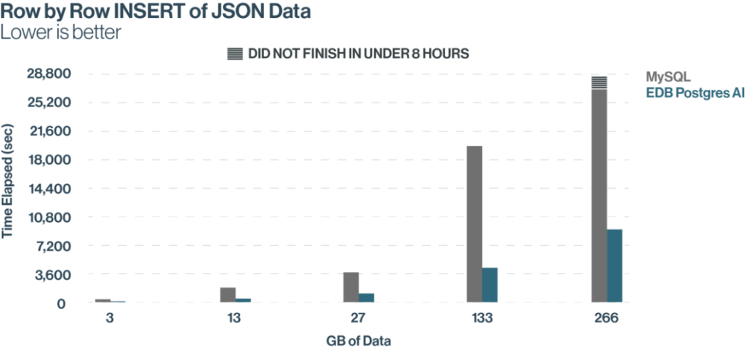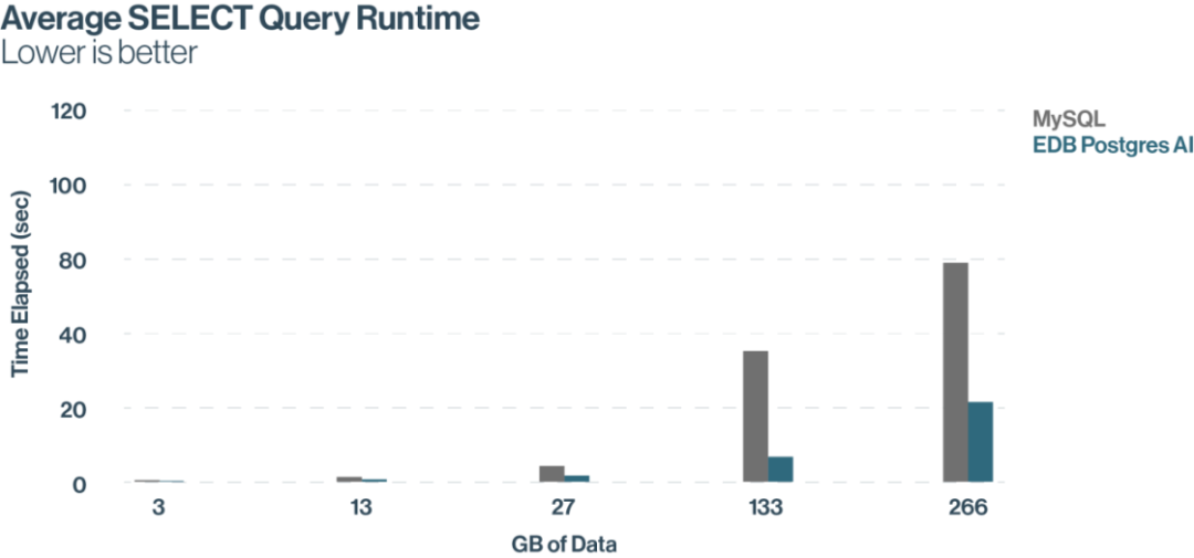 PG NoSQL 基准测试结果提供了对 EDB 和 MySQL 在不同数据量下的原始 NoSQL 性能的洞察。 - 对于批量加载,EDB 比 MySQL 快 63%。 - 对于逐行 INSERT,EDB 比 MySQL 快 4 倍以上。 - 对于平均 SELECT 查询时间,EDB 几乎比 MySQL 快 3 倍。