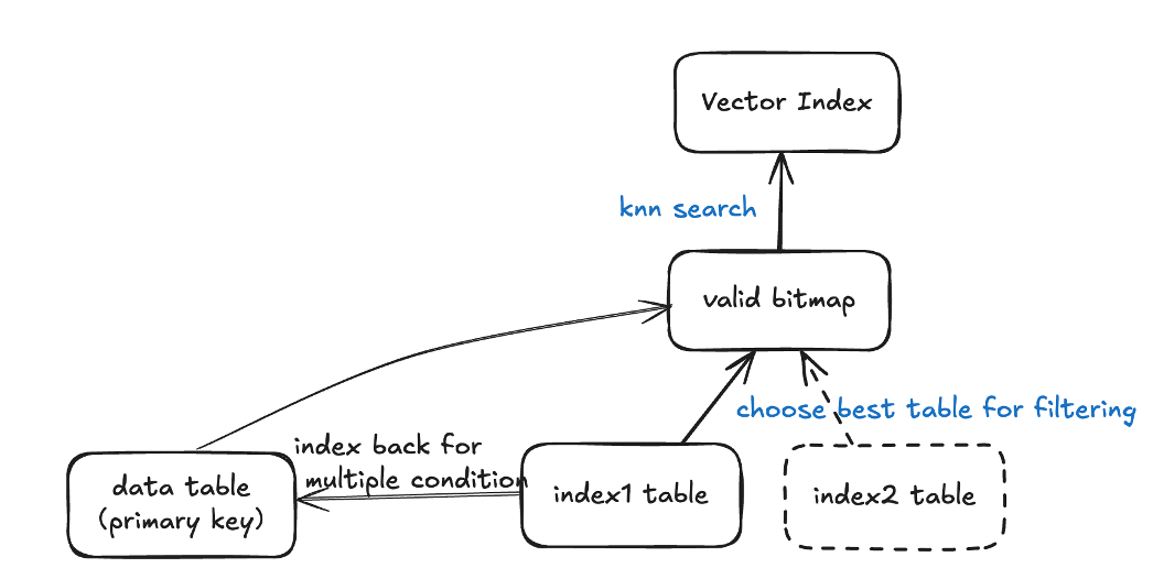 Pre-filtering 的问题在于,如果标量过滤条件的过滤率低(即过滤后剩下的数据量依然很大),或者条件太复杂(比如条件涉及多列),进行标量过滤的代价甚至会大于向量索引近似最近邻查询的代价。比如有 100 万条数据,经过过滤后留下了 10 万条,而且过滤条件涉及多列,那么即使选中了合适的索引,也需要进行 10 万次回表计算,耗时可想而知。