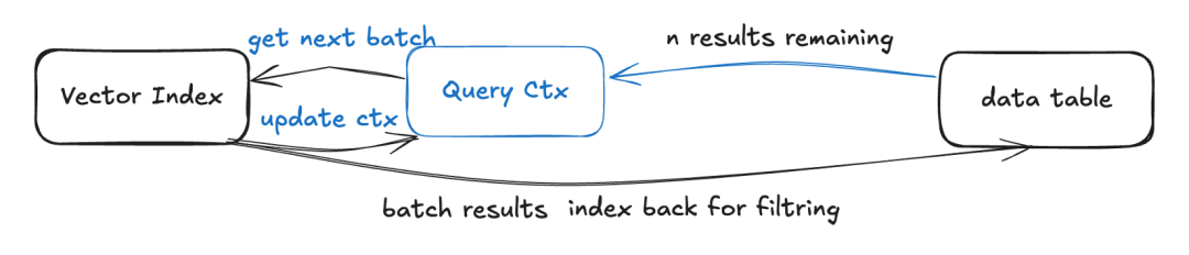 于是,我们来到了最后一种方案,它的全称叫迭代式近似最近邻查询(Iterative-Ann),或者简单地称之为迭代式过滤。在这种方案里,我们先进行向量索引的查询,但是在查询的过程中,会把查询的上下文保存下来,在每一轮向量索引查询后再进行过滤,如果发现有一部分数据是不满足要求的,则会恢复上下文,从上一次迭代的位置开始,继续搜索近似最近邻。