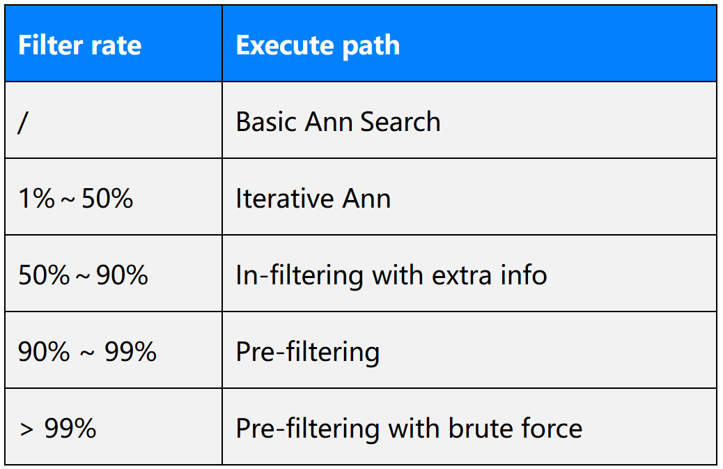 在这种情况下,如果标量的过滤率比较低,则意味着大部分数据都会保留下来,因此可能只需要几次迭代就能获得想要的结果。举个例子,在需要搜 100 条结果、标量过滤率是 50% 的情况下,在第一次迭代中向量索引查询出 100 条结果,经过过滤后留下 50 条,那么接下来再经过一两轮迭代,就很可能填满 100 条结果的要求,而这个过程中过滤条件的执行次数只有两三百次。也就是说,在过滤率(filter rate)中低场景,且过滤条件复杂的情况下,迭代式过滤反而计算量少,性能明显优于前述两种方案。