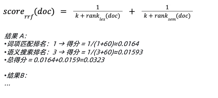 另一种方法叫做倒数排序融合(Reciprocal rank fusion),不需归一化,只根据结果集中的排名对其进行评分,比如向量查出十条结果,第一名的 rank 值是 1,第十名 rank 就是 10,以此类推。在没有先验知识的情况下,使用这种排序方法通常就能够取得比较好的效果了。