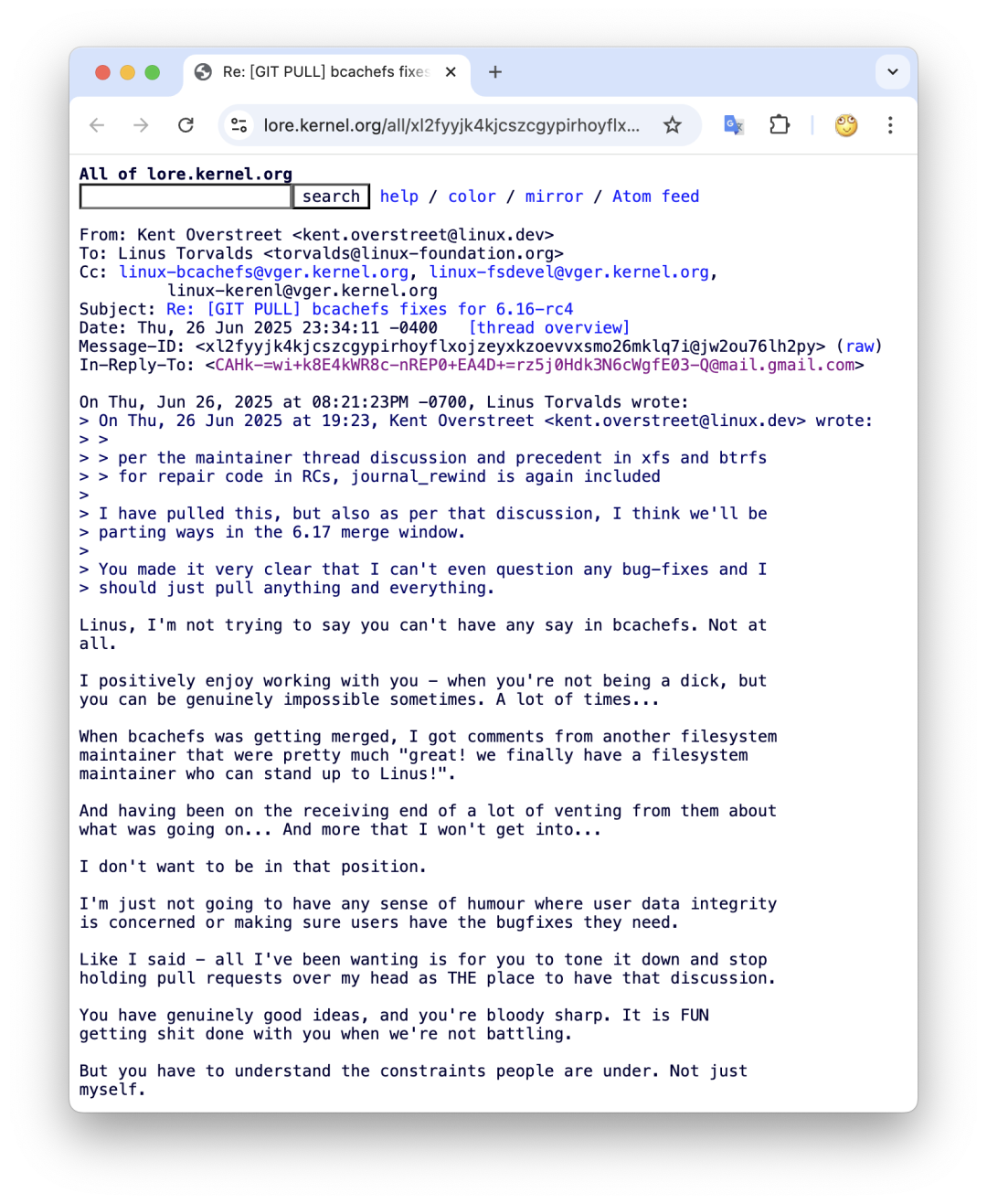 只可惜,Linus 的态度已经被彻底触怒。在和 Kent Battle 期间,Linus 勉强接受 了那份包含争议功能的 Pull Request(也就是暂时合入了“journal-rewind”补丁),但随即放出狠话:“补丁我拉了,但照我们讨论的情况来看,6.17 合并窗口的时候,我们恐怕就要分道扬镳了。你已经明确表示我今后对你的补丁连问都不该问,反正你递过来的东西我就得全盘照收。说真的,在那种情况下,我完全不觉得参与其中还有任何意义。我们俩最后似乎唯一达成的共识就是—— “到此为止”(“we're done”)—— Linus 已经决定不再掺和 Bcachefs 的维护,言下之意就是要把它踢出内核主线。