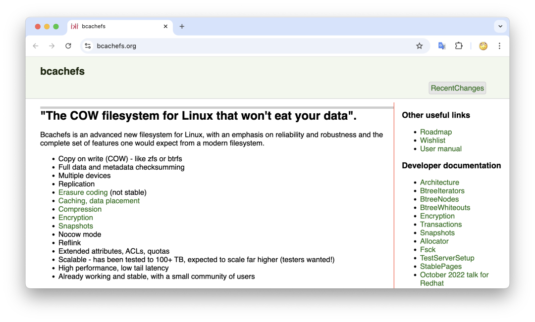2015 年 Kent 宣布开始研发 Bcachefs;经过近十年打磨,Bcachefs 在 2024 年初的 Linux 6.7 版本中被并入内核主线。Bcachefs 声称要融合 ZFS、Btrfs 那样的现代特性与 ext4、XFS 等传统文件系统的性能。然而理想很丰满,现实很骨感,Bcachefs 自打进入主线以来问题不断。