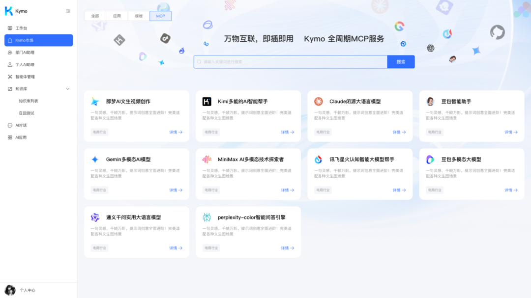 Kymo开发管理套件将企业AI应用管理与AI应用开发完美集成,提供一站式的AI应用开发、AI Agent集中化管理、AI Agent权限管控、MCP服务、企业级应用市场、AI生态、企业知识库(RAG增强)、AI 工具、AI安全、AI合规审计等,兼顾企业级AI智能体开发纵横需求与灵活部署落地。