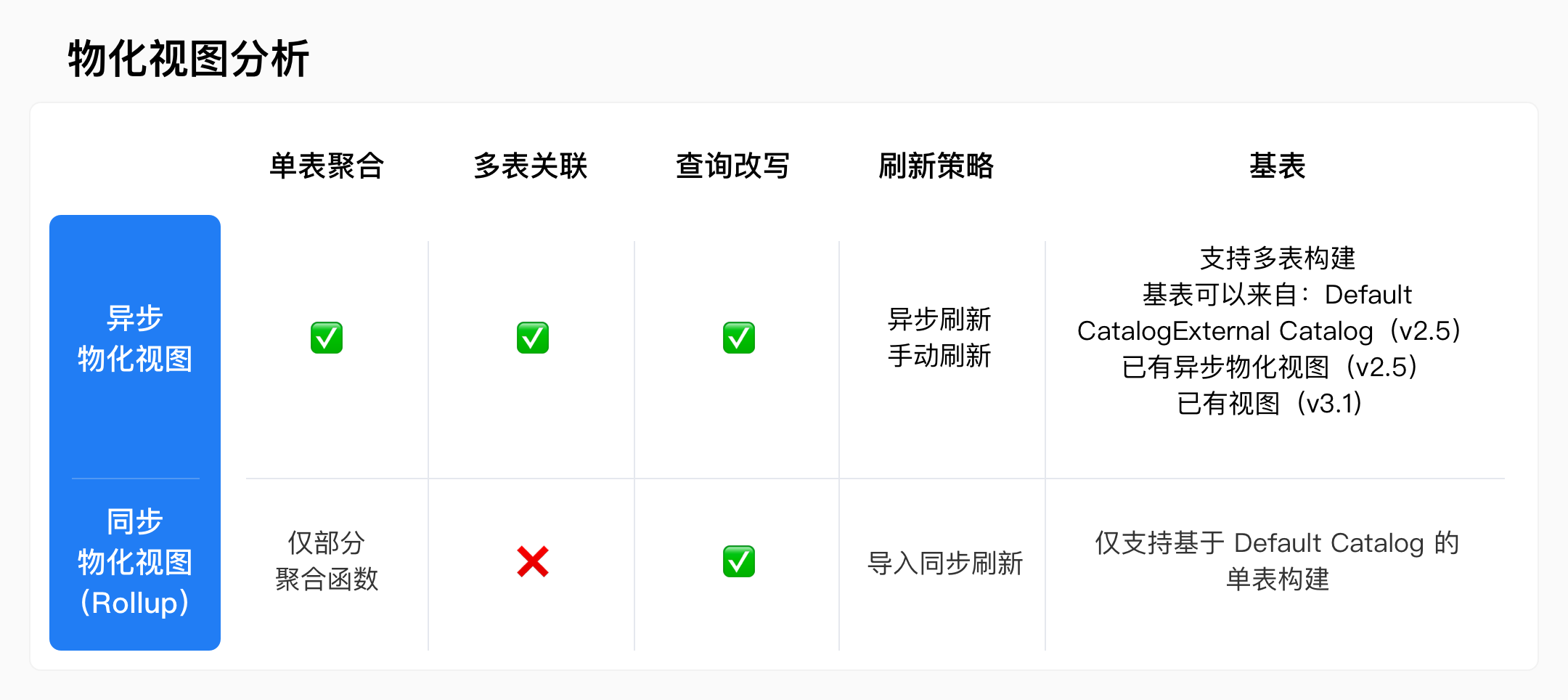 异步物化视图不支持使用 List 分区策略,不支持基于使用 List 分区的基表创建。 查询改写只支持Cardinality Preservation Join(结果集行数不会超过输入表中的任意一方) 不支持grouping set、grouping set with rollup 以及 grouping set with cube 的查询改写 分区物化视图只支持 Range 分区