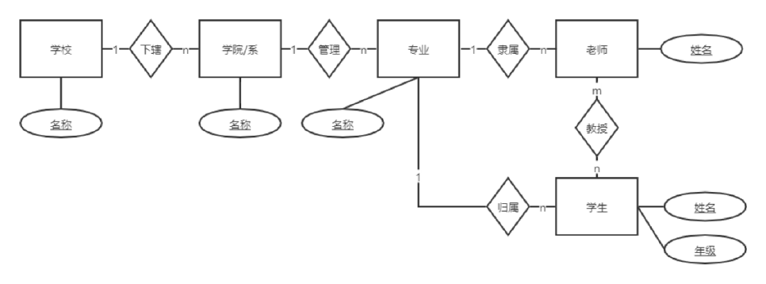比如上图中的学校肯定有一个学校名称的,那这个名称就是学校的一个属性,所以名称这个属性用椭圆形表示,并用线链接到学校,代表这个是学校的一个属性。
