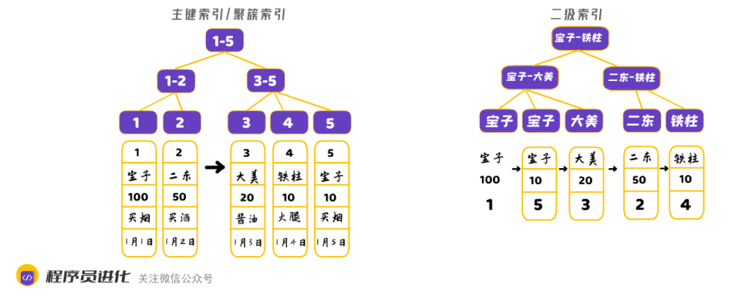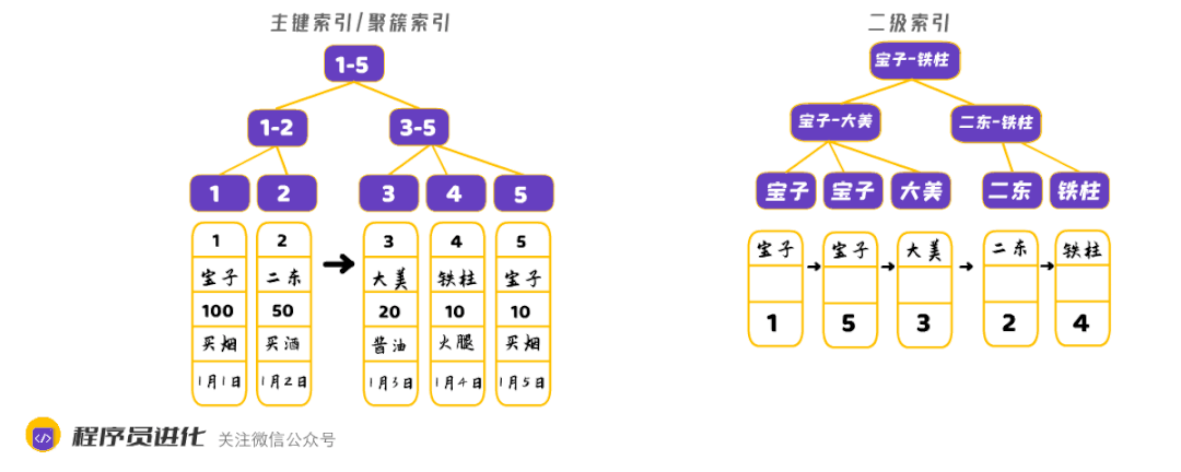 当查询 ”宝子“的欠款记录时,先走二级索引,然后在叶子节点上找到对应的主键值,再回到主键索引中去找到对应的值,这个过程叫回表,回表的成本很高,因为在二级索引上有三次I/O,然后主键索引中又产生三次I/O.