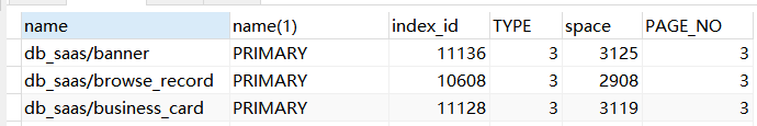 SELECT b.name,a.name,index_id,TYPE,a.space,a.PAGE_NOFROM information_schema.INNODB_SYS_INDEXES a,information_schema.INNODB_SYS_TABLES bWHERE a.table_id = b.table_idAND a.space <> 0;