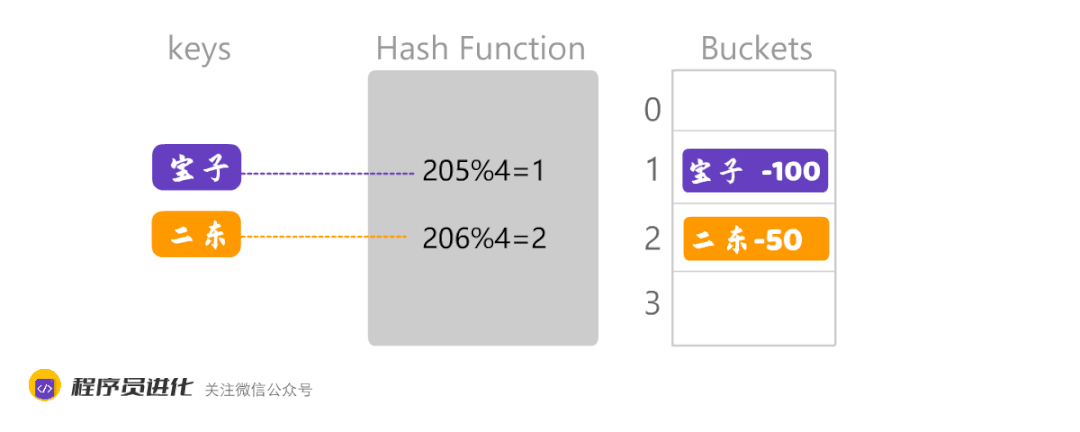 将单词转化为大数的过程的哈希化,就像下图宝子哈希化之后是205,然后再采用取余的方法,计算出数组中的位置。