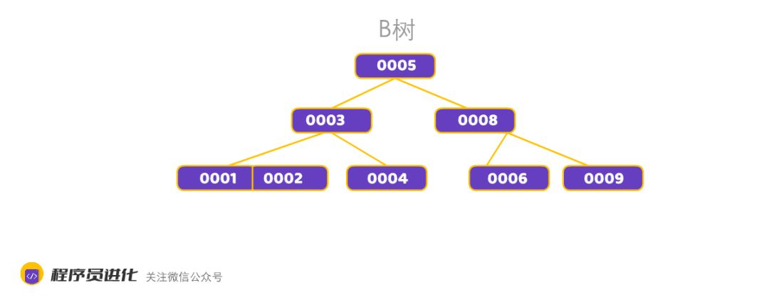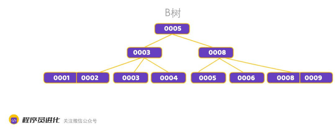 这颗B树是不是很熟悉,比如我们想找0002,那我先从根节点开始,发现小于5,那就找左子树,然后发现小于0003,那再找0003的左子树。这与和我们刚才猜价格的二分查询非常相似。其实B 树是一个查找二叉树,他都是越靠前的子树越小,并且,同一个节点内,关键字按照大小排序;