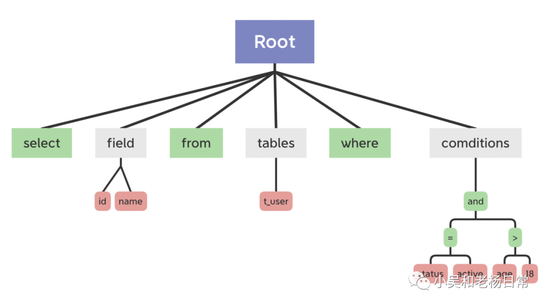SQL解析过程分为词法解析和语法解析。词法解析器用于将SQL拆解为不可再分的原子符号,称为Token。并根据不同数据库方言所提供的字典,将其归类为关键字,表达式,字面量和操作符。再使用语法解析器将SQL转换为抽象语法树。例如,以下SQL:
