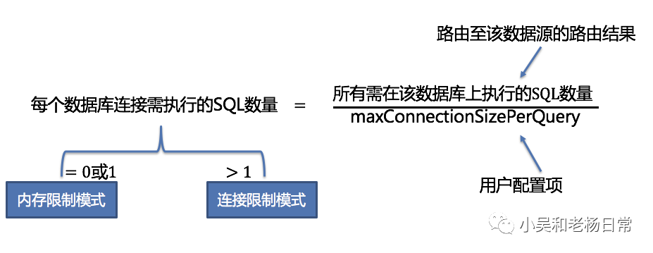 将 SQL 的路由结果按照数据源的名称进行分组。 通过下图的公式,可以获得每个数据库实例在 maxConnectionSizePerQuery