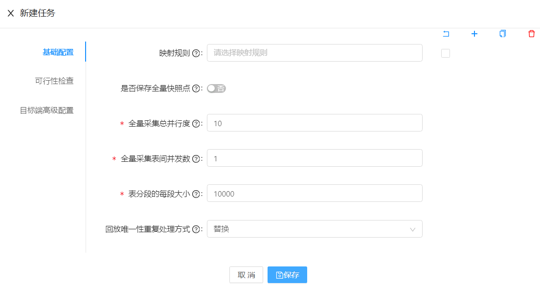 遇到目的端主键冲突时处理方式,分为忽略/替换/日志写入/中止退出4种方式,默认为替换
