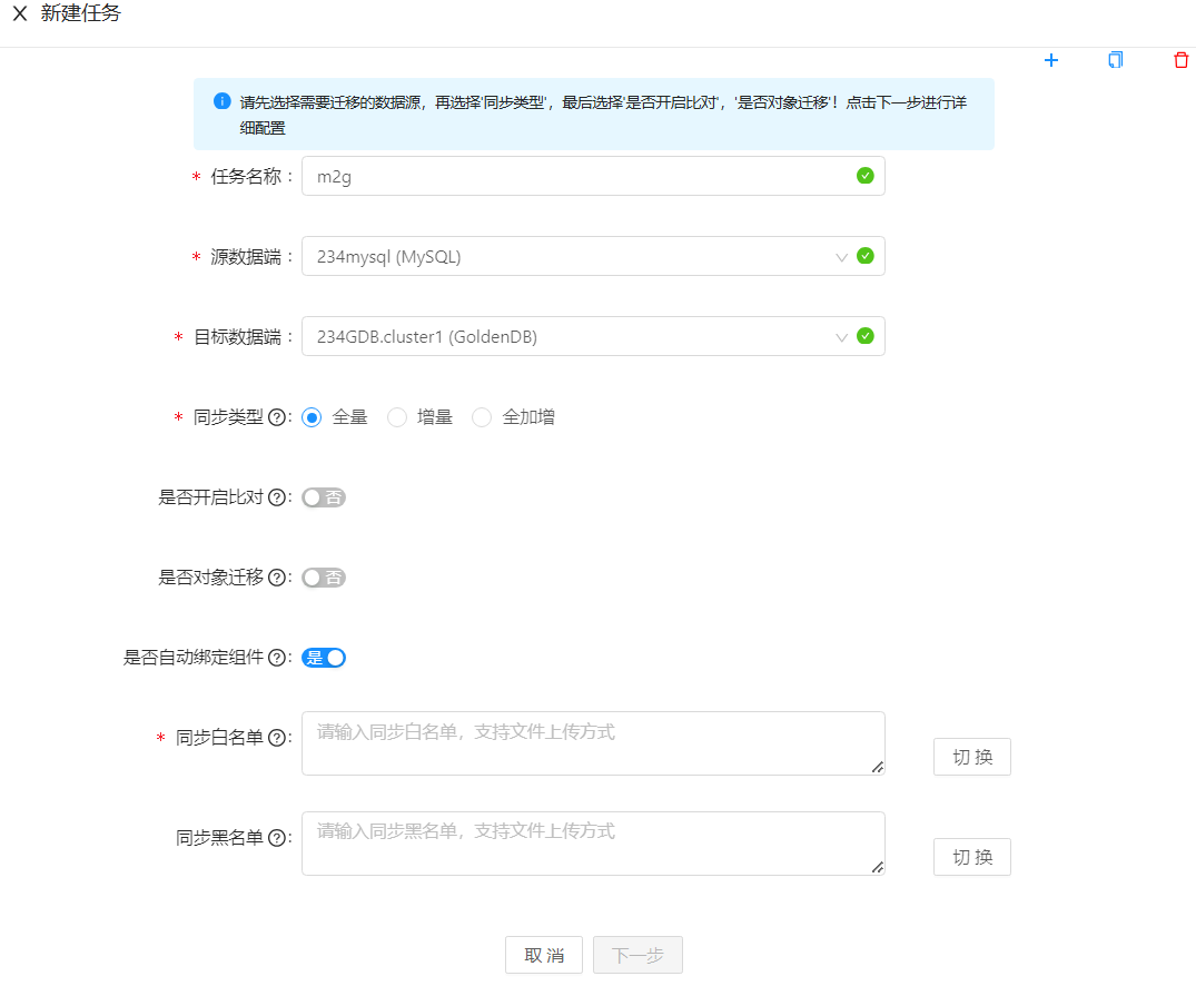 选择是时,在全量迁移过程中进行数据比对,选择否时,不进行数据比对。