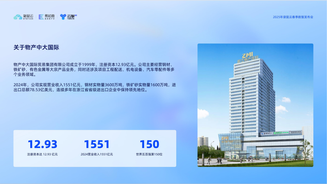 物产中大国际贸易集团有限公司成立于1999年,公司主要经营钢材铁矿砂、有色金属等大宗商品业务,2024年,公司营业收入1551亿元,进出口总额78.53亿美元,母公司位列世界五百强第150位,是当之无愧的行业龙头企业。