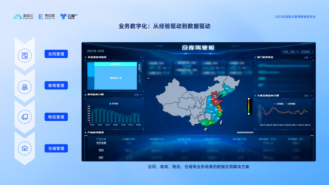 业务数字化:开发了合同、客商、物流、仓储、⿊研等业务场景的数据应⽤解决⽅案,实现经营业务全周期管控,优化业务流程,提升业务效率和效益,真正实现了从经验驱动到数据驱动。