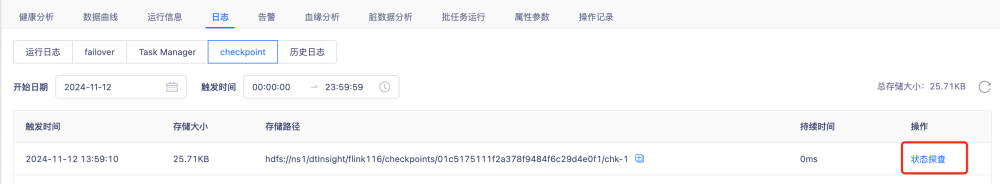 在实时计算平台,进入「任务运维」页面。 在任务列表中,选择目标任务,点击「CheckPoint」选项。 选择一个最近的 CheckPoint(CK),点击「状态探查」按钮。