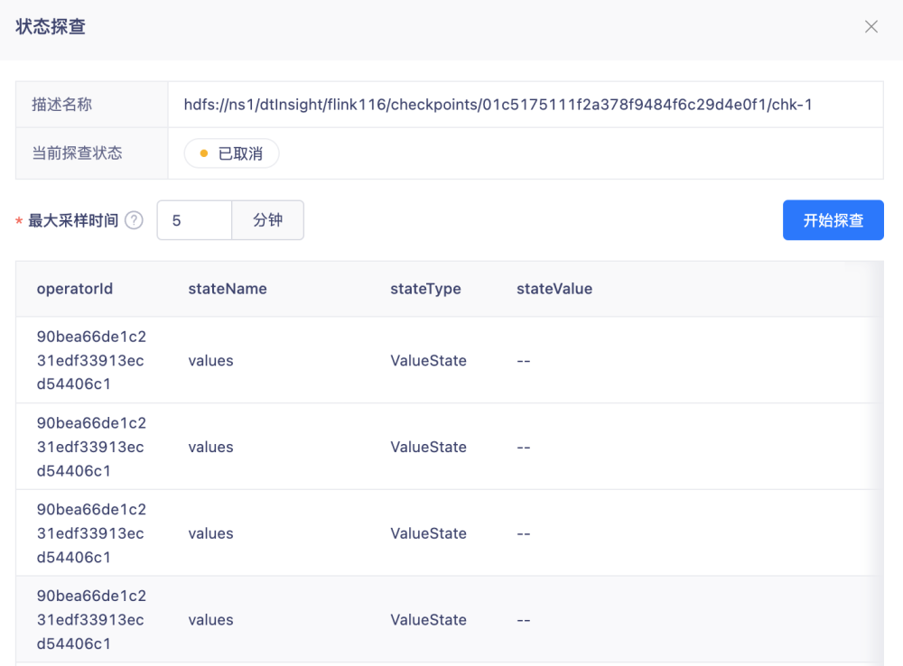 探查完成后,状态变为「探查完成」。 页面实时刷新显示State页面最新「状态结果」 。 State 中记录着窗口的累计值。此时可以检查:是否有窗口状态数据丢失或异常(例如:某个窗口内的总金额为负值或远低于预期)