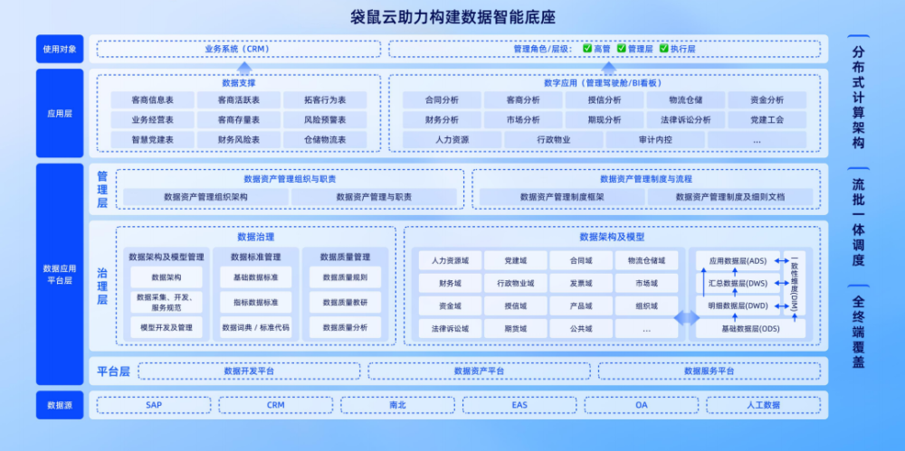 在大型集团方面,某大型央企随着企业数字化转型不断深化,数据应用方面的需求不断扩展,出现数据价值不凸显,数据标准不统一,数据质量不可控,数据共享不畅通等问题。在此背景下,袋鼠云对企业现有存量数据进行数据治理及挖掘,搭建数据管理体系,对增量数据进行有效管理和应用。通过梳理目前企业所有存量数据,提炼运营指标及管理指标,科学化管理公司数据资产和挖掘数据价值。