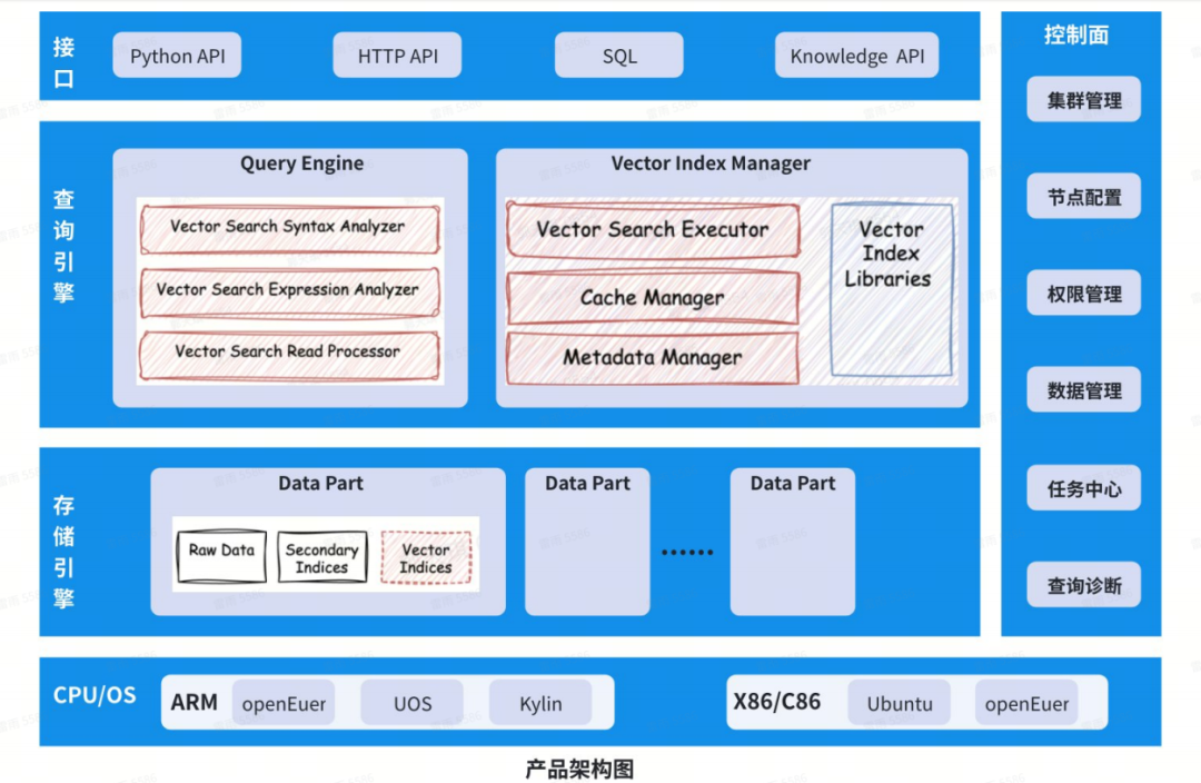 2. 高性能向量检索:具备支持千亿级向量规模、万级QPS以及毫秒级查询延迟的能力。