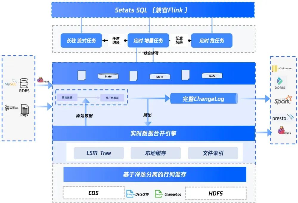 支持 Changelog 增量机制 支持批处理与 OLAP 查询 秒级数据可见性 支持存算分离的 State 管理 支持丰富的 Upsert 逻辑 原生兼容 Apache Iceberg